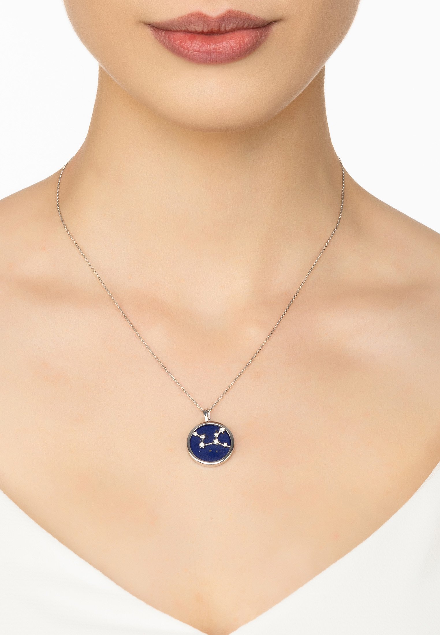 The pendant showcases a delicate engraving of your star sign on the reverse side, surrounded by cut-out stars that allow the lapis lazuli to peek through. This thoughtful design element makes the necklace not just a piece of jewelry, but a personal statement that reflects your astrological identity. The pendant is encased in high-quality 925 sterling silver, ensuring durability and a luxurious finish. The addition of handset white cubic zirconia adds a touch of sparkle, making it perfect for both everyday wear and special occasions.