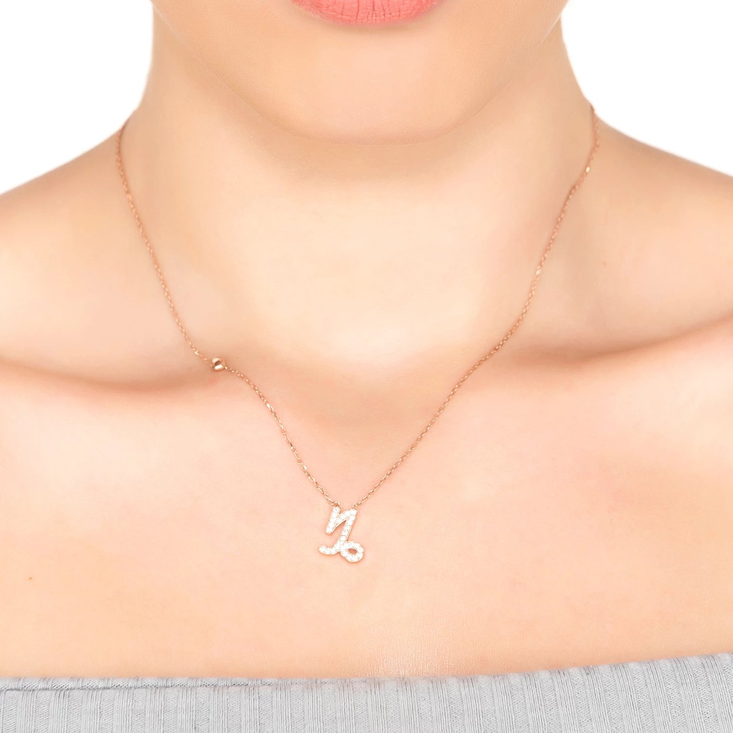 The pendant motif measures 1.5cm x 1cm, making it a delicate yet noticeable accessory. The intricate design showcases the Capricorn symbol, beautifully adorned with sparkling zircons that catch the light from every angle. This attention to detail ensures that the necklace stands out, whether you're dressing up for a special occasion or adding a touch of elegance to your everyday look.