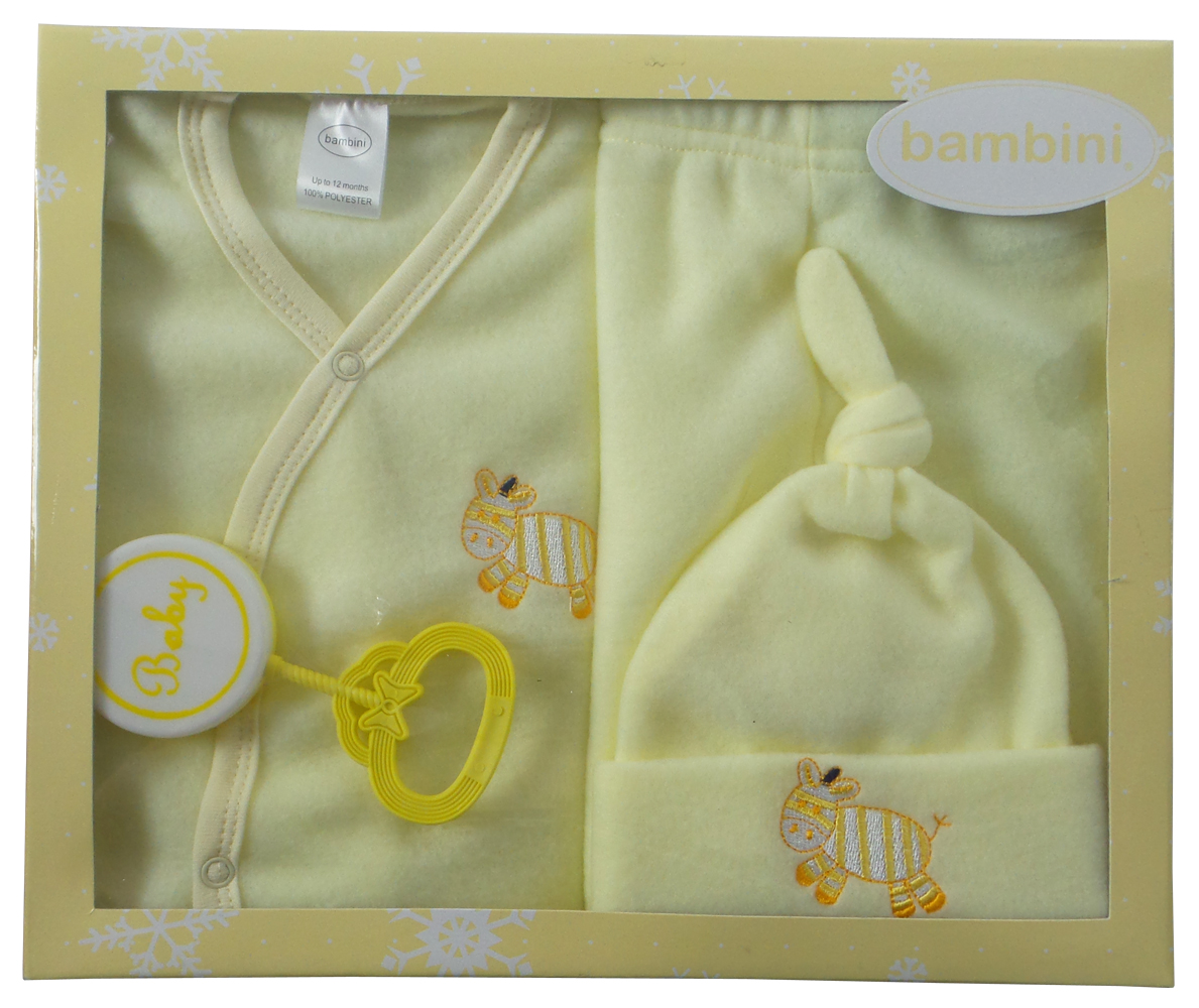 Introducing the 4 Piece Fleece Set in a delightful pastel yellow, designed specifically for newborns. This charming boxed gift set is an essential starter kit for new mothers, providing them with the necessary garments for their little ones. The set includes a collar-less jacket, a cozy hat, a pair of soft pants, and a delightful rattle, ensuring that every new mommy has everything she needs to keep her baby comfortable and stylish. The soft fleece fabric is gentle against a newborn's delicate skin, making it an ideal choice for everyday wear. The jacket features a simple yet elegant design, allowing for easy dressing and undressing, while the hat provides warmth and protection for the baby's head. The pants are designed for comfort and ease of movement, allowing your little one to kick and wiggle freely. The included rattle adds an element of fun and engagement, helping to stimulate your baby's senses and encourage playtime. This 4 Piece Fleece Set is not only practical but also makes for a beautiful gift. The pastel yellow color is perfect for spring, evoking feelings of warmth and joy. Whether you're attending a baby shower, celebrating a new arrival, or simply looking to pamper a new mom, this set is a thoughtful choice. Please note that the patterns shown in the images are for illustration purposes only, and you may receive a different pattern in the selected color. This set is available in newborn size only, ensuring a snug fit for your little one. Each set comes beautifully packaged in a box, making it ready for gifting. With one set per box, you can easily wrap it up and present it to the new mom in your life. The 4 Piece Fleece Set is a must-have for any new parent, combining functionality with style. The soft and warm fleece material is perfect for keeping babies cozy during cooler months, while the cheerful yellow color adds a touch of brightness to any outfit. This set is not just about clothing; it’s about creating memorable moments with your newborn. The rattle included in the set is designed to be lightweight and easy for tiny hands to grasp, promoting sensory development and hand-eye coordination. As your baby grows, they will enjoy the sounds and textures of the rattle, making it a cherished toy for years to come. The versatility of this set allows for mixing and matching with other baby clothing items, providing endless outfit possibilities. The jacket can be layered over other garments for added warmth, while the pants can be paired with different tops for a variety of looks. This adaptability makes the 4 Piece Fleece Set a valuable addition to any newborn's wardrobe. In summary, the 4 Piece Fleece Set in yellow is a beautifully crafted gift set that combines comfort, style, and practicality. It is an essential item for new parents, providing them with the basics they need to care for their newborn. The soft fleece fabric, thoughtful design, and cheerful color make this set a standout choice for any occasion. Whether you're purchasing it for yourself or as a gift, this set is sure to delight and impress. Make the first days of parenthood a little easier and a lot more stylish with this adorable fleece set.