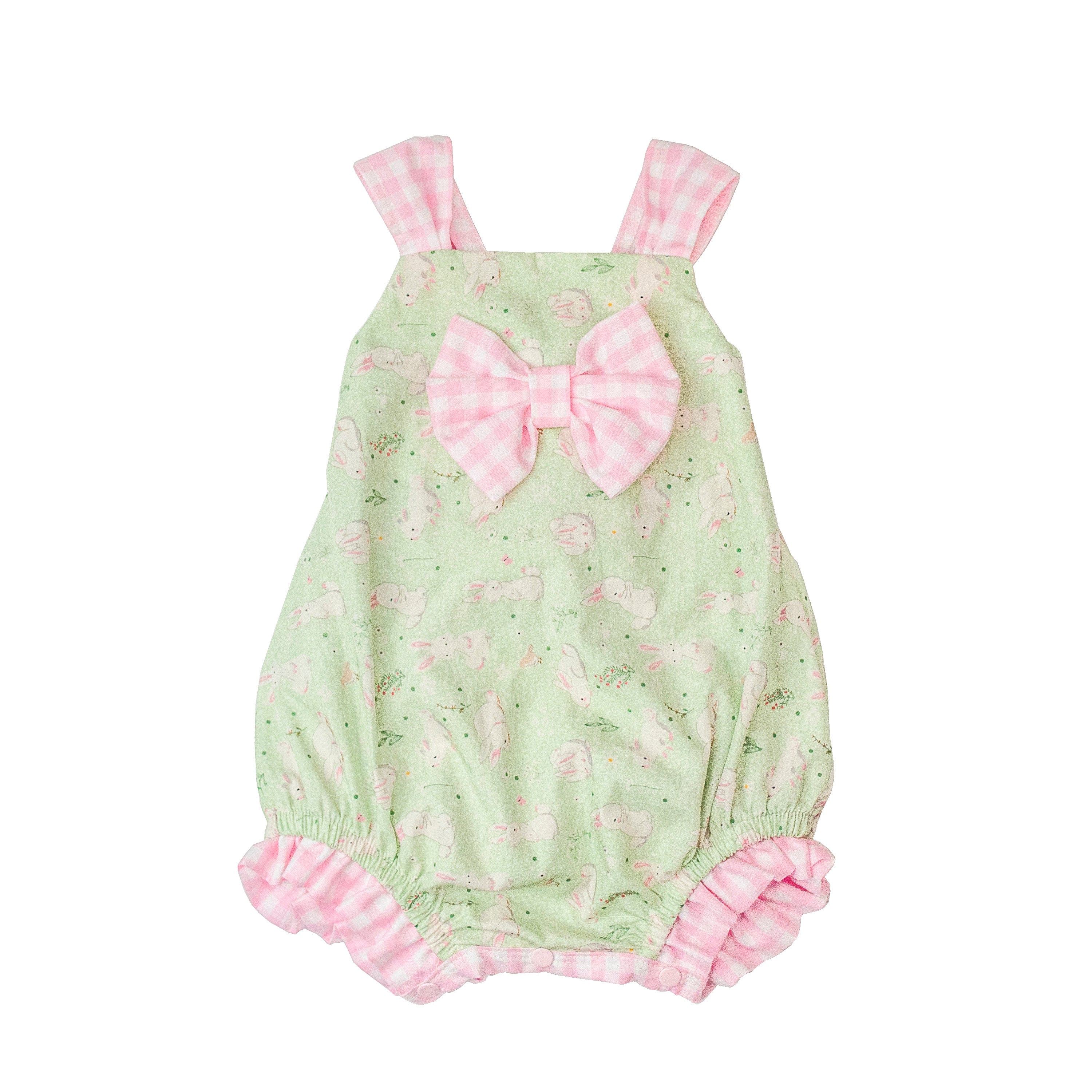 The Bunny Love romper also includes a sash tie at the back, allowing for an adjustable fit. This feature not only enhances the overall look of the romper but also ensures that it fits snugly and comfortably on your little girl. The sash tie adds a lovely finishing touch, making this romper a standout piece in any child's wardrobe.