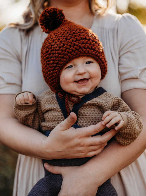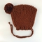 Handmade knit bonnet with pom. Made to stretch to fit the shape of the head.