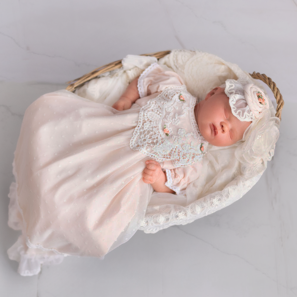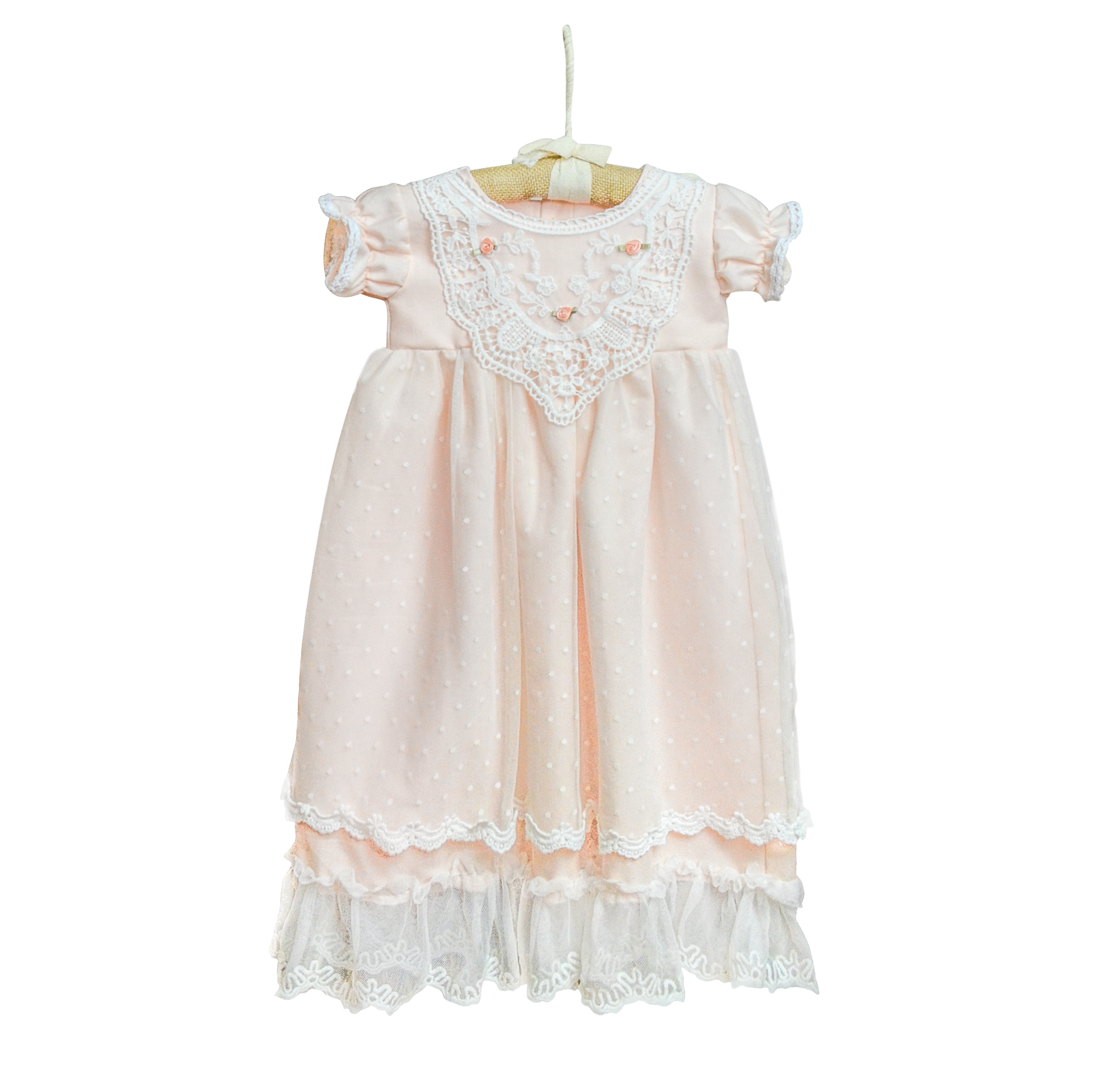 The Caroline Gown is a stunning addition to any baby girl's wardrobe, designed with elegance and charm in mind. This beautiful gown features a classic pastel peach color that exudes warmth and sweetness, making it an ideal choice for various occasions, from family gatherings to formal events.