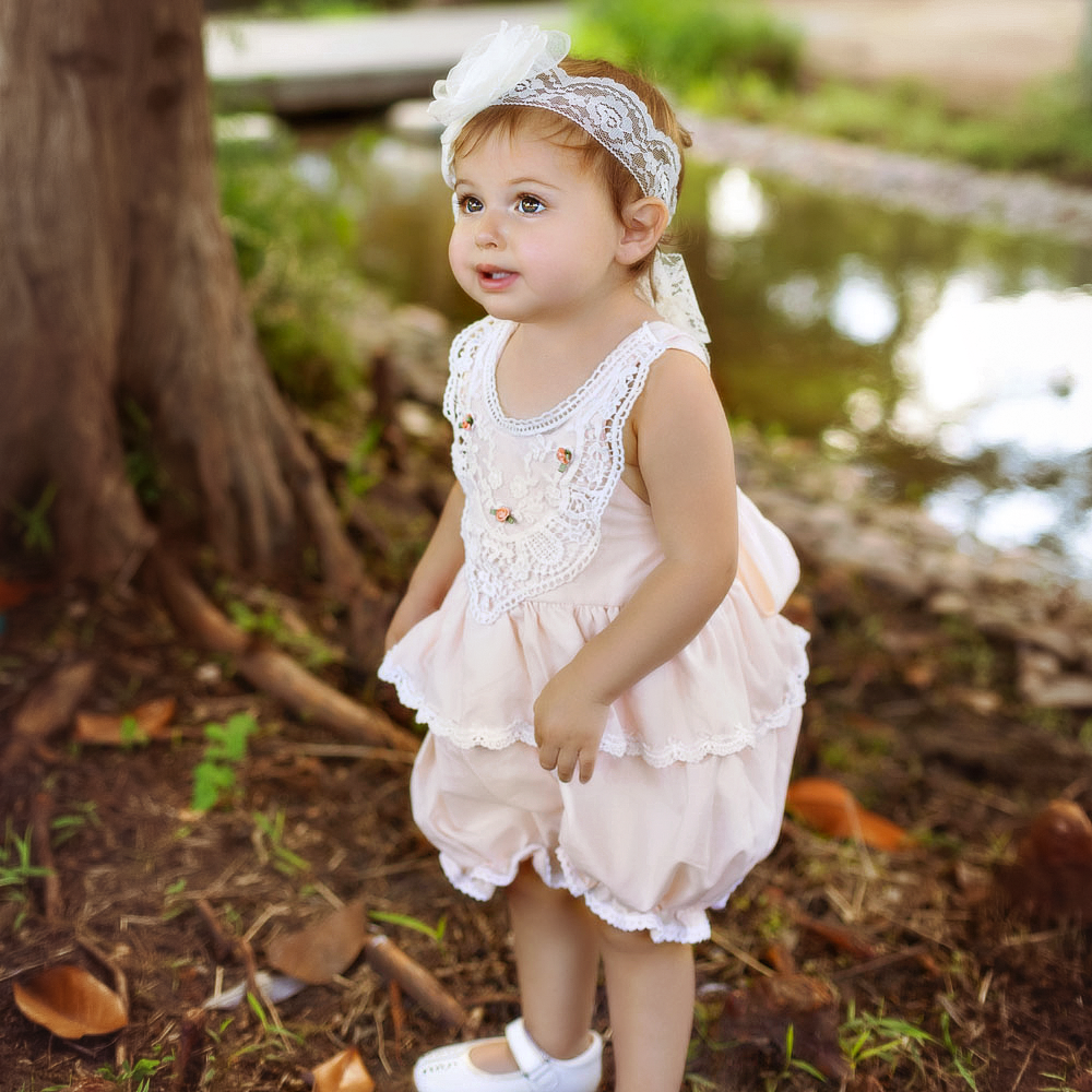 The pastel peach hue of the Caroline Sunsuit is soft and inviting, making it a perfect choice for spring and summer outings. The delicate roses add a touch of elegance and femininity, making it suitable for both casual and semi-formal events. This combination of colors and patterns creates a timeless look that can be cherished for years to come.