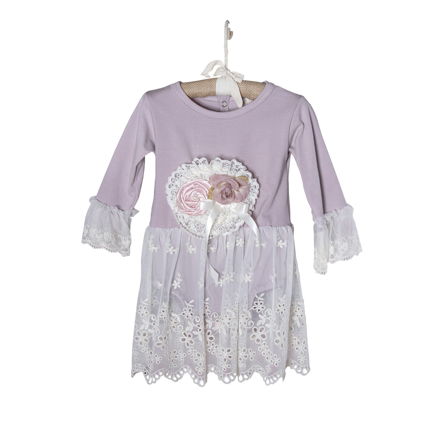 A beautiful creamy purple diaper dress with classic lace detailing, perfect for babies.