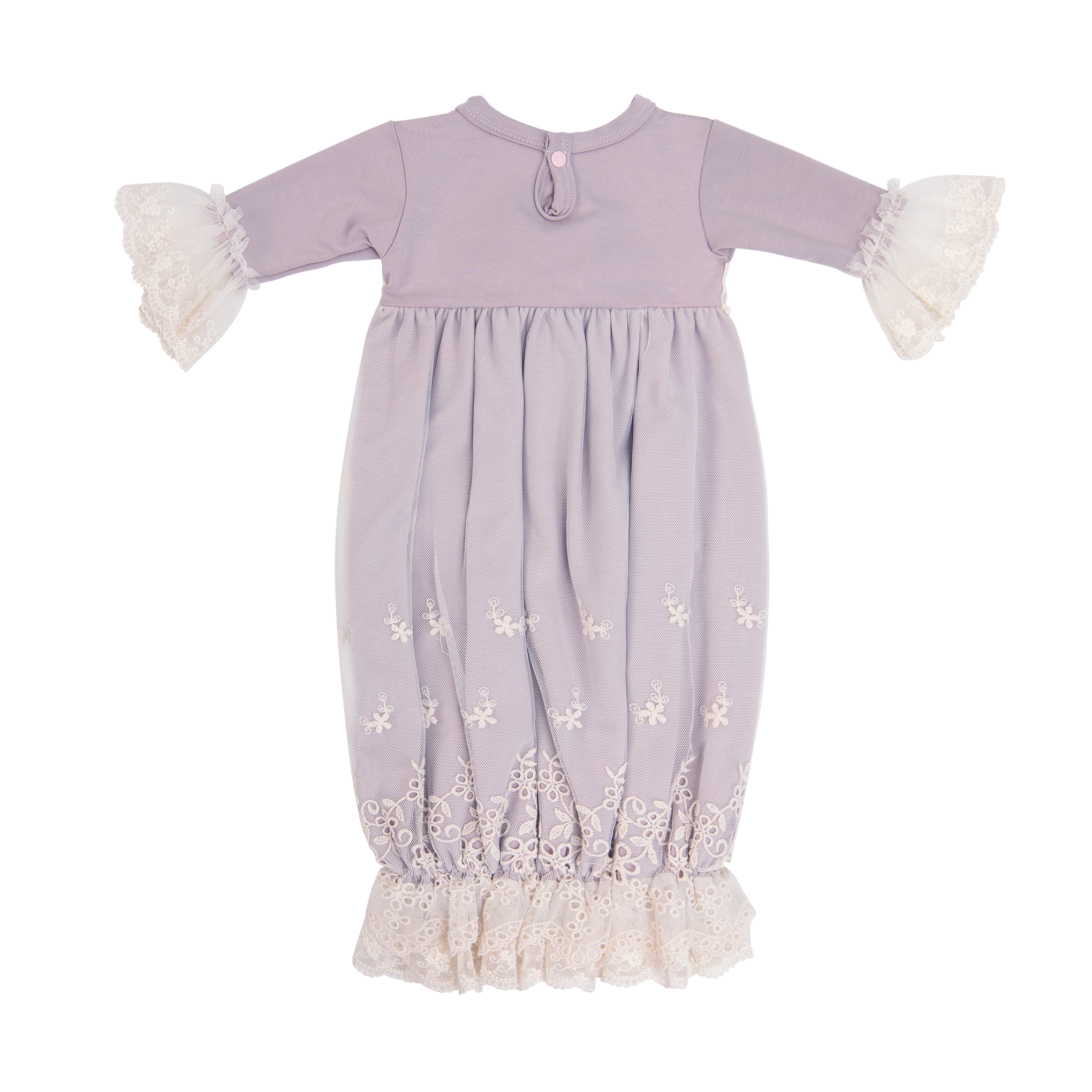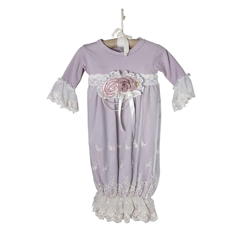 The Genevie Gown is a stunning piece that combines elegance and comfort, making it the perfect choice for your little one's special occasions. With its creamy purple hues and intricate lace detailing, this gown is designed to create a dreamy look that will make your baby the center of attention.