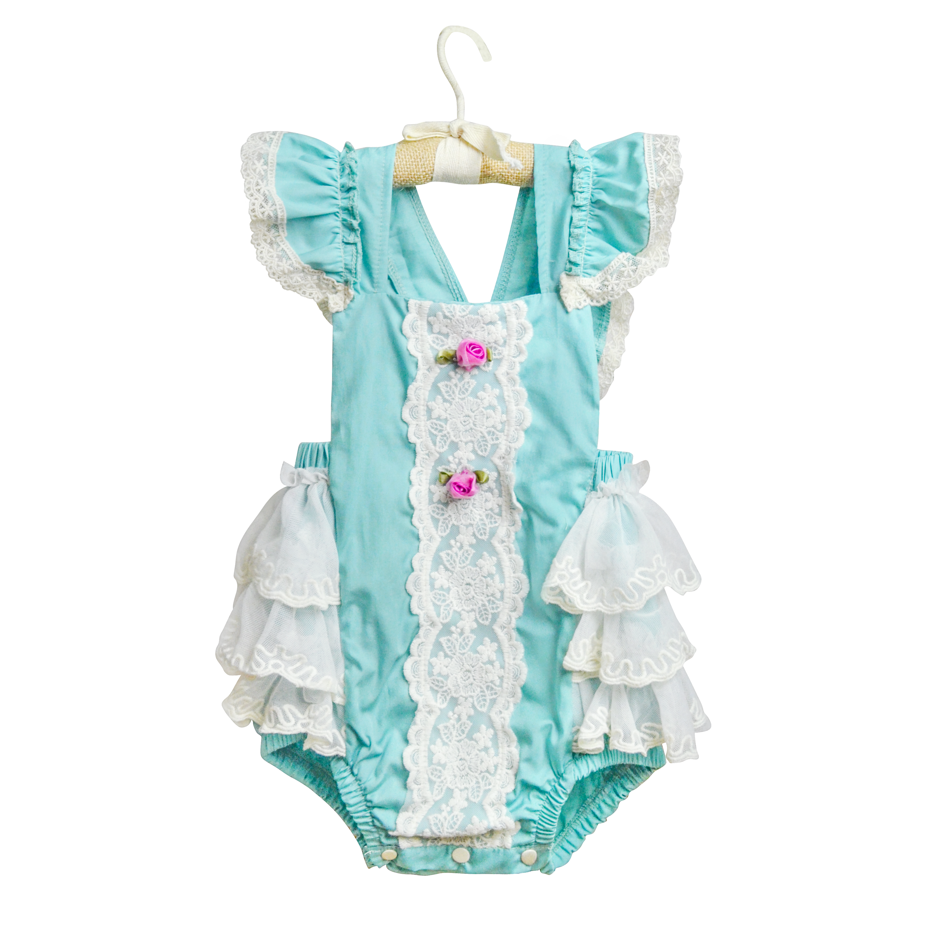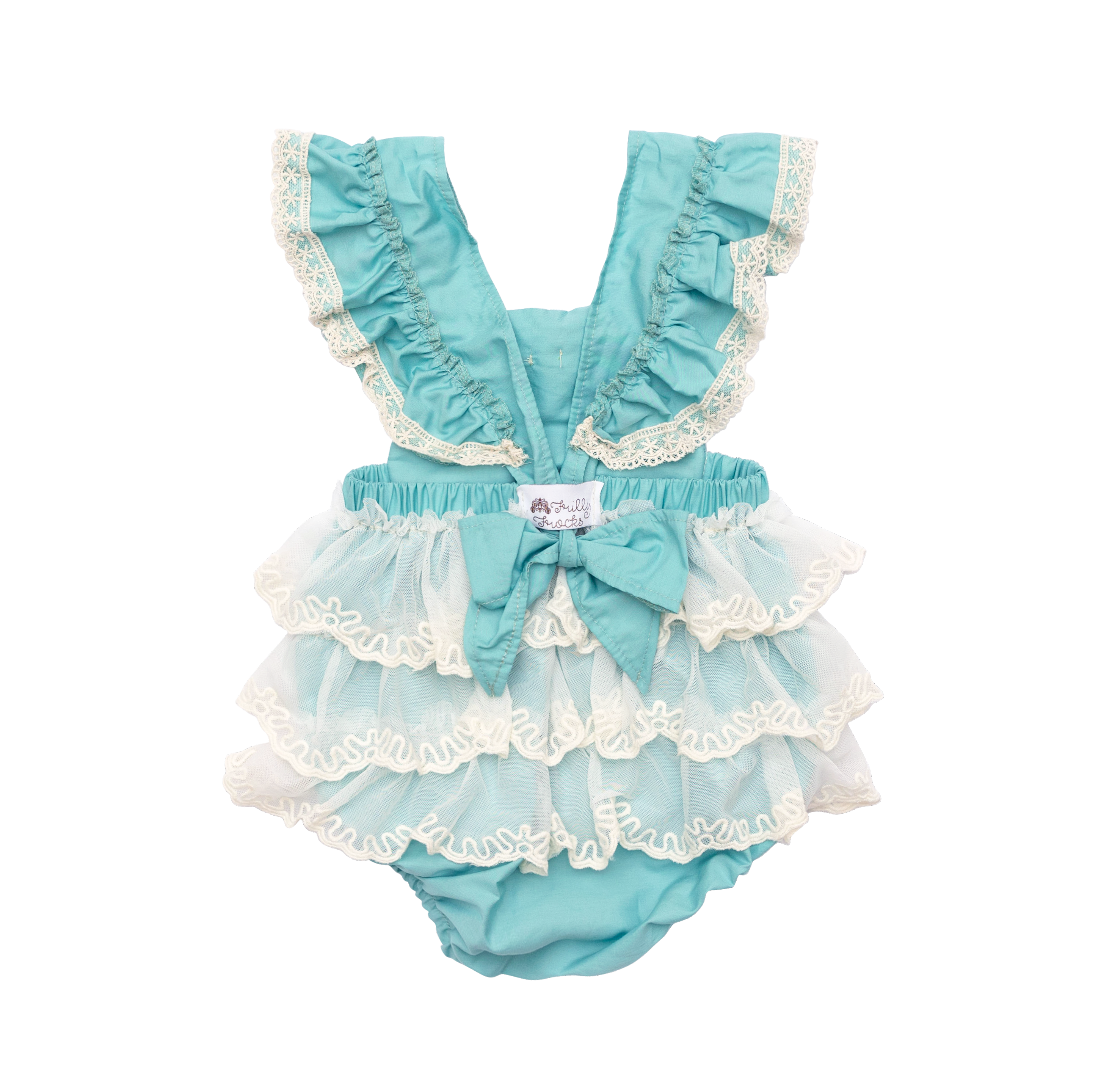 A beautiful turquoise sunsuit for girls featuring ruffles, lace, and rosettes, perfect for summer wear.