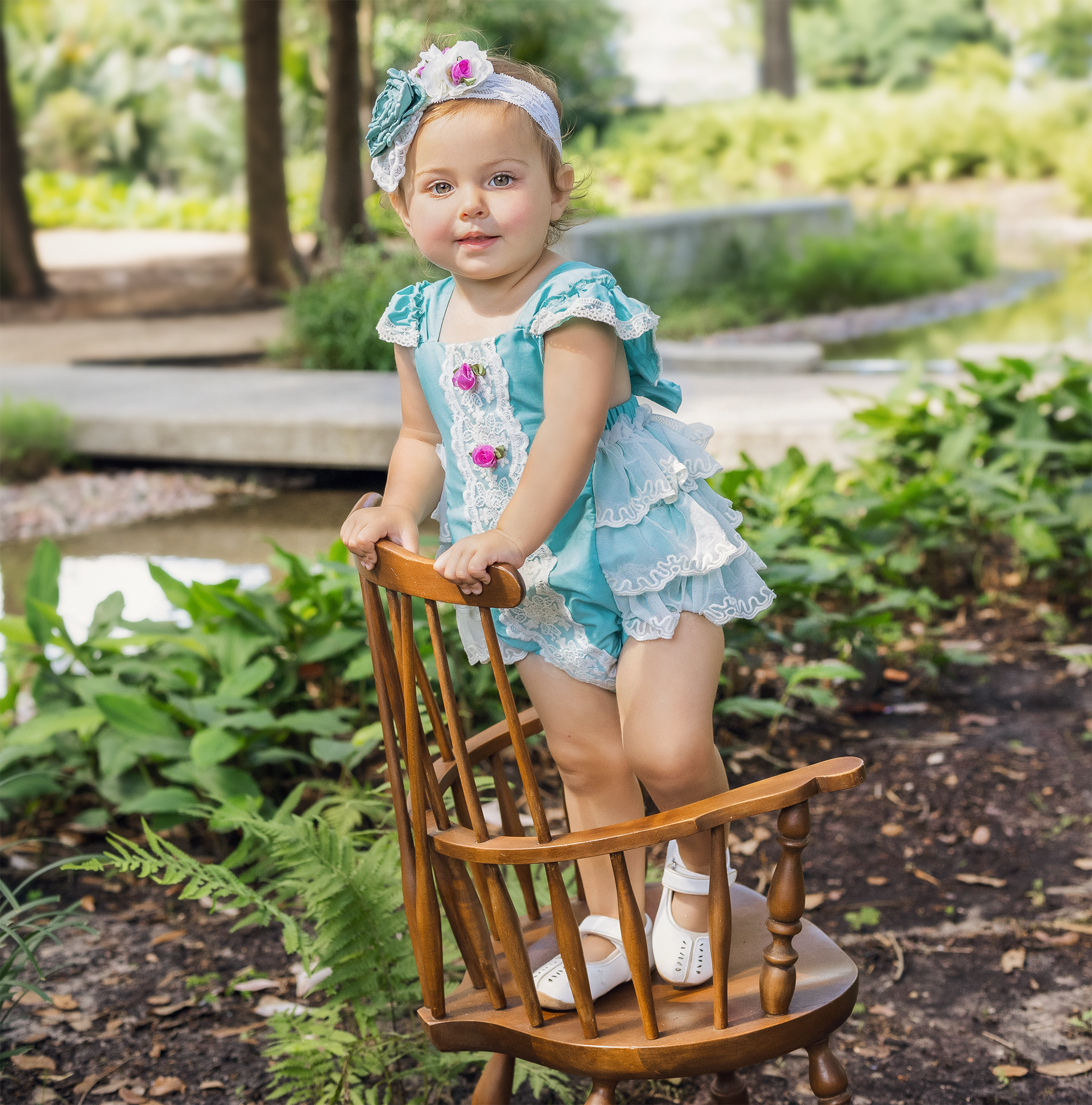 In summary, the Harper Sunsuit is a must-have for any little girl's summer wardrobe. With its beautiful turquoise color, charming ruffles, and delicate lace, it is sure to become a favorite. Make this summer unforgettable with the perfect outfit that combines style, comfort, and versatility.