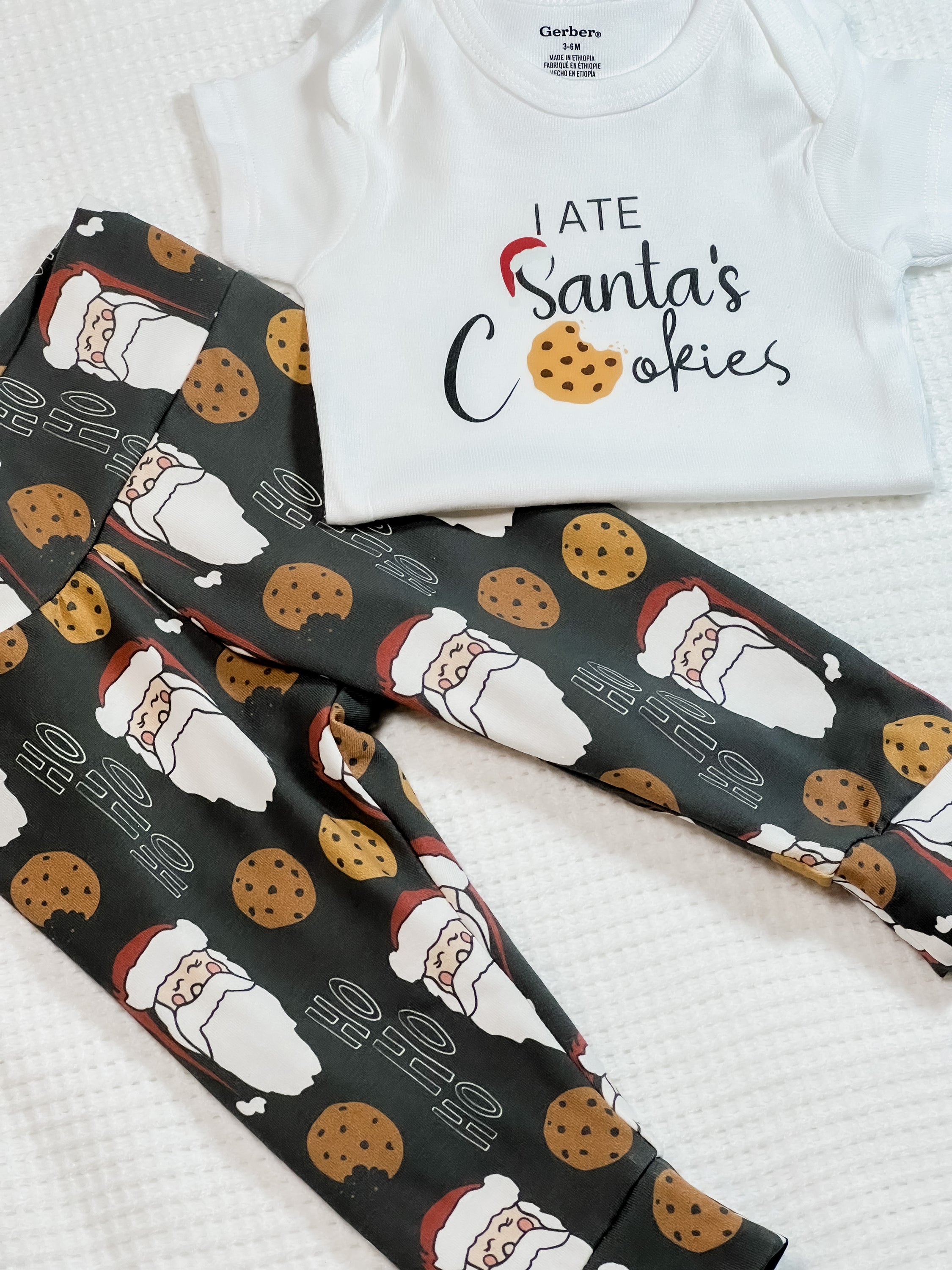 The I ate Santa's Cookies baby outfit is available in various sizes to accommodate your growing baby. The leggings come in sizes 0-3M, 3-6M, and 6-12M, while the bodysuit is available in sizes 0-3M, 3-6M, and 12M. This range ensures that you can find the perfect fit for your little one, making it a versatile choice for any occasion.