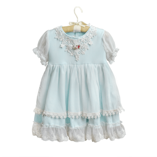 Pastel blue Iris Baby Dress featuring rosettes and a lace collar, perfect for young girls.