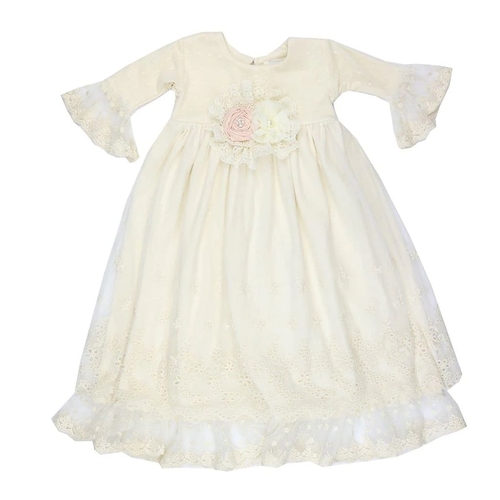 The gown's off-white color exudes purity and grace, making it a timeless piece that can be cherished for years to come. The delicate lace adds a touch of sophistication, while the rosettes provide a sweet and feminine touch. This combination ensures that your baby girl will look absolutely precious in her first photos.
