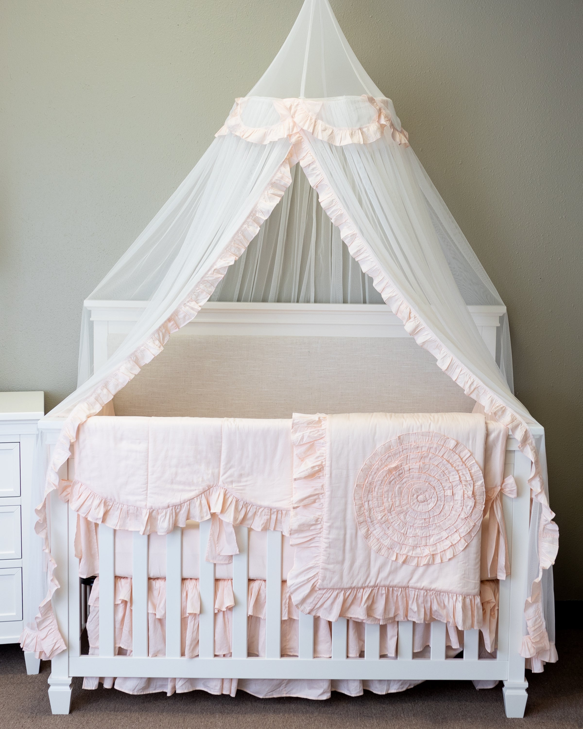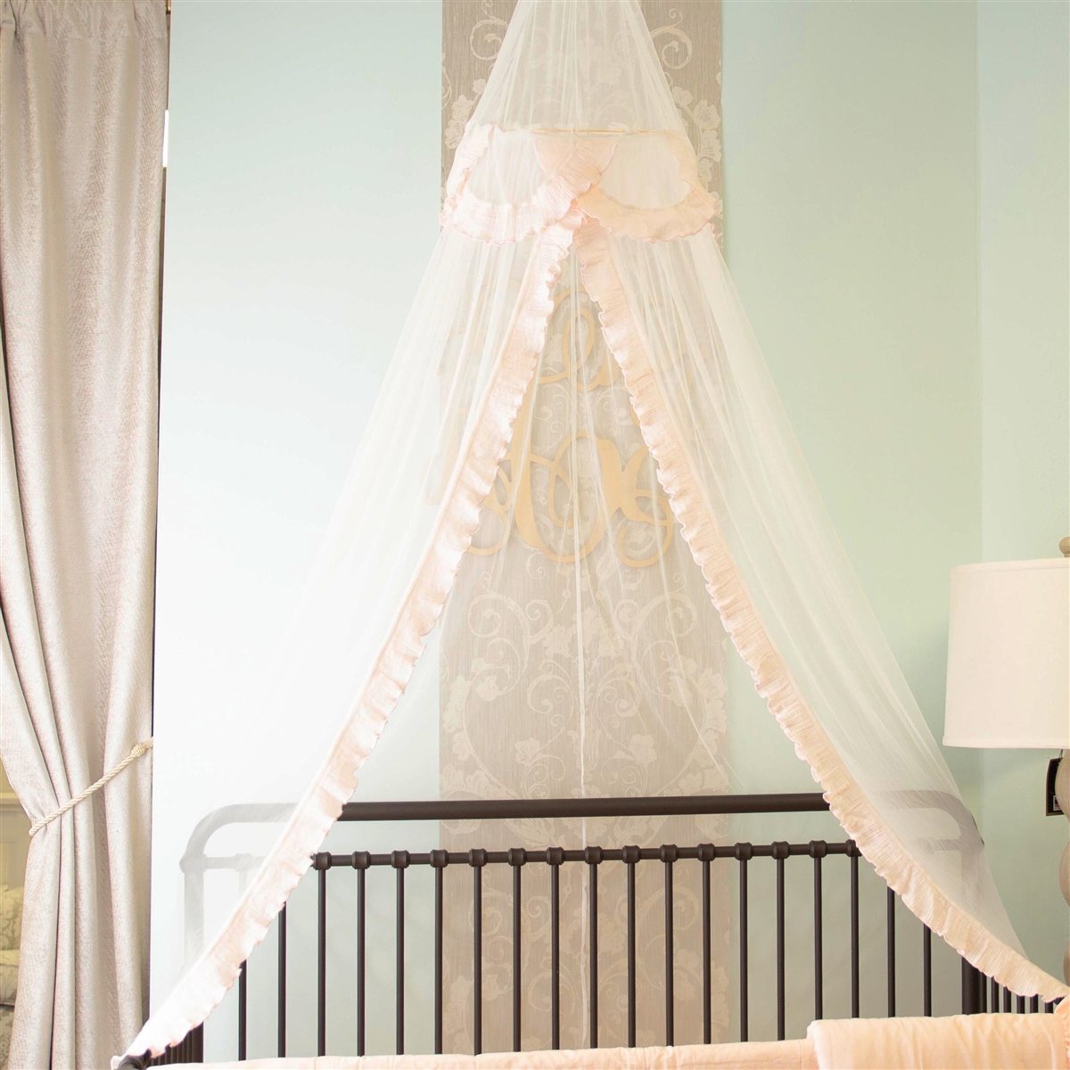 The canopy features a delicate lace trim that adds a sophisticated touch to the overall design. Its soft blush pink color complements a variety of nursery themes, making it a versatile choice for parents looking to create a serene environment for their little ones. The lightweight tulle fabric allows for gentle airflow, ensuring that your baby stays comfortable while sleeping or playing.