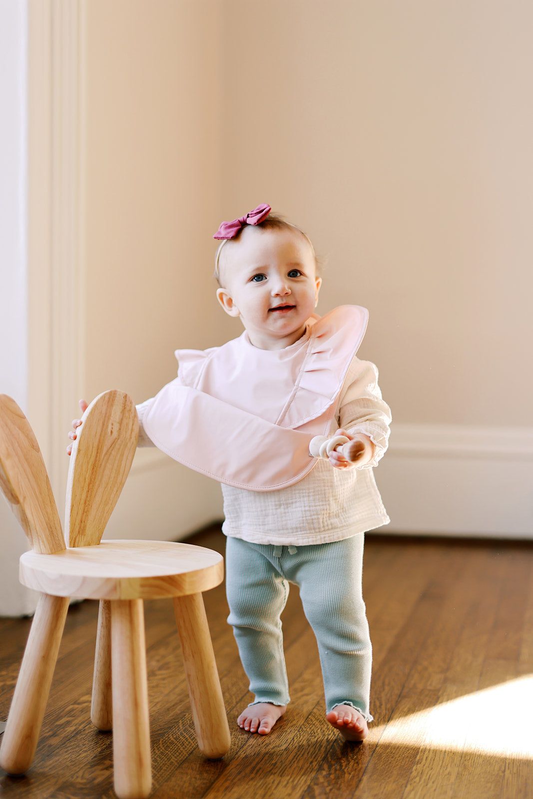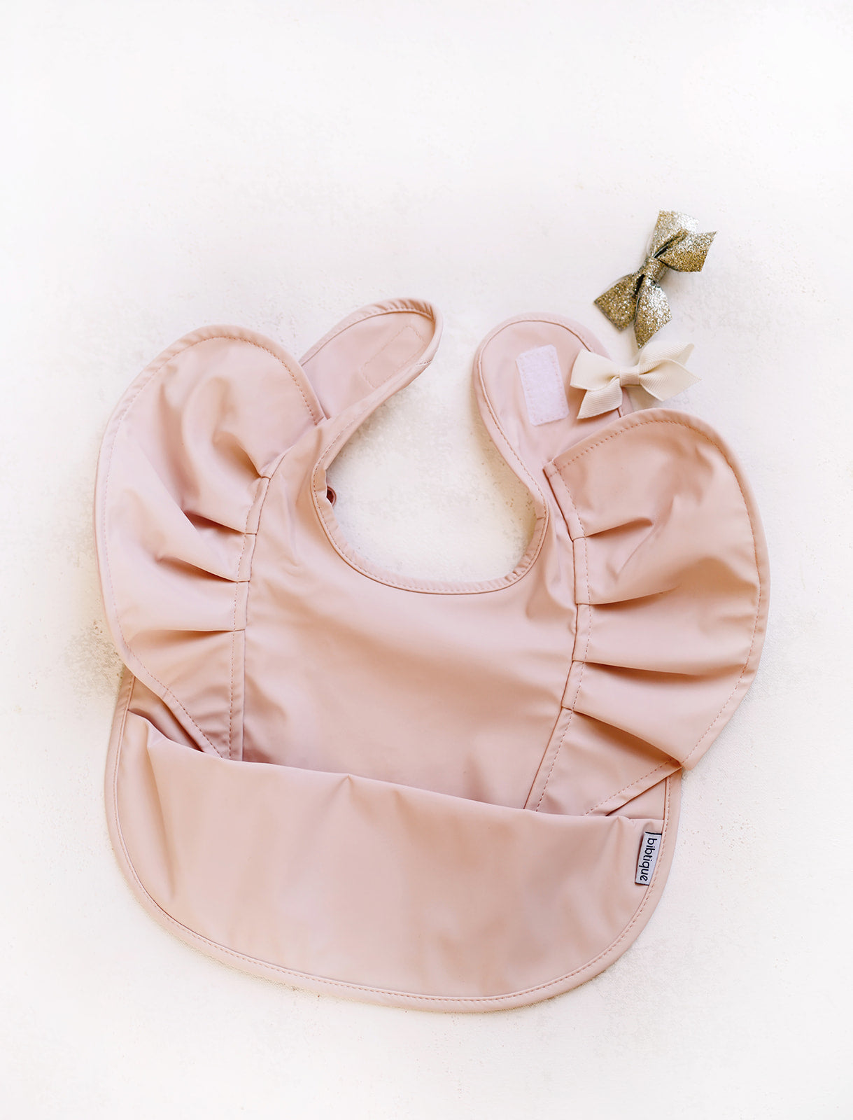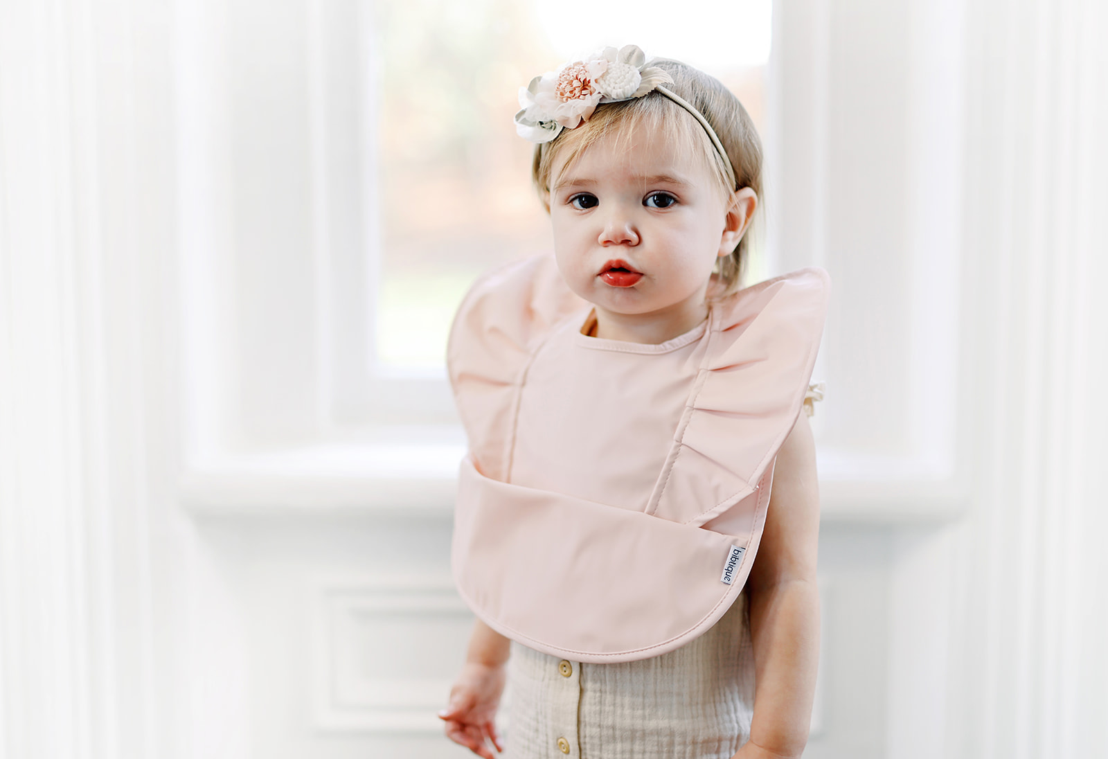 Whether you're feeding your baby at home, at a restaurant, or during playdates, the Peach Blush Ruffle Angel Bib is the ideal companion. Its stylish design and practical features make it suitable for any occasion. Plus, its lightweight nature makes it easy to carry in your diaper bag, ensuring that you're always prepared for mealtime.