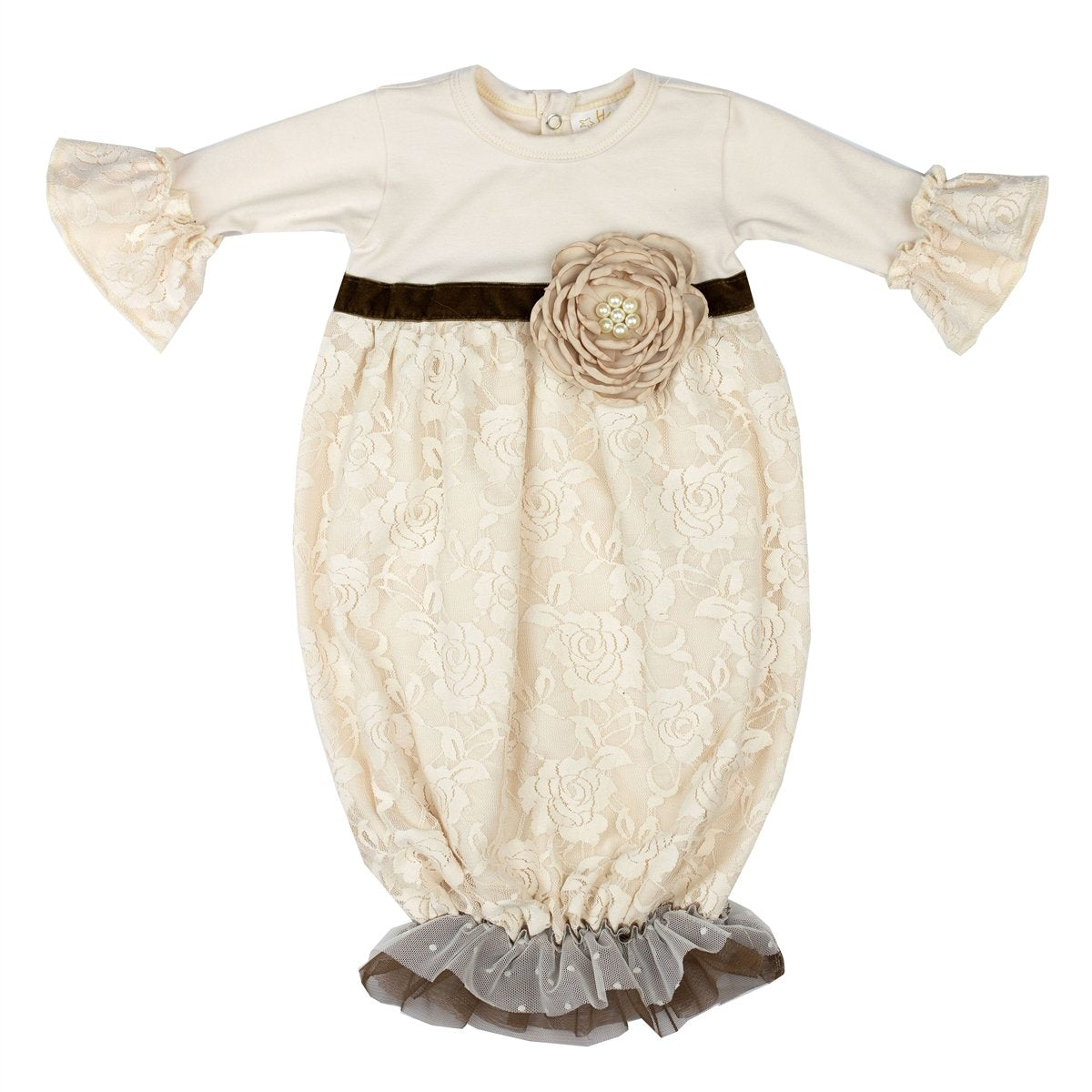 The Vanilla Sugar Take Me Home Gown stands out with its beautiful lace ruffles. These charming details not only enhance the gown's aesthetic appeal but also make it a standout piece for any baby girl's wardrobe. The classic cream color complements any nursery theme and is versatile enough for various occasions.