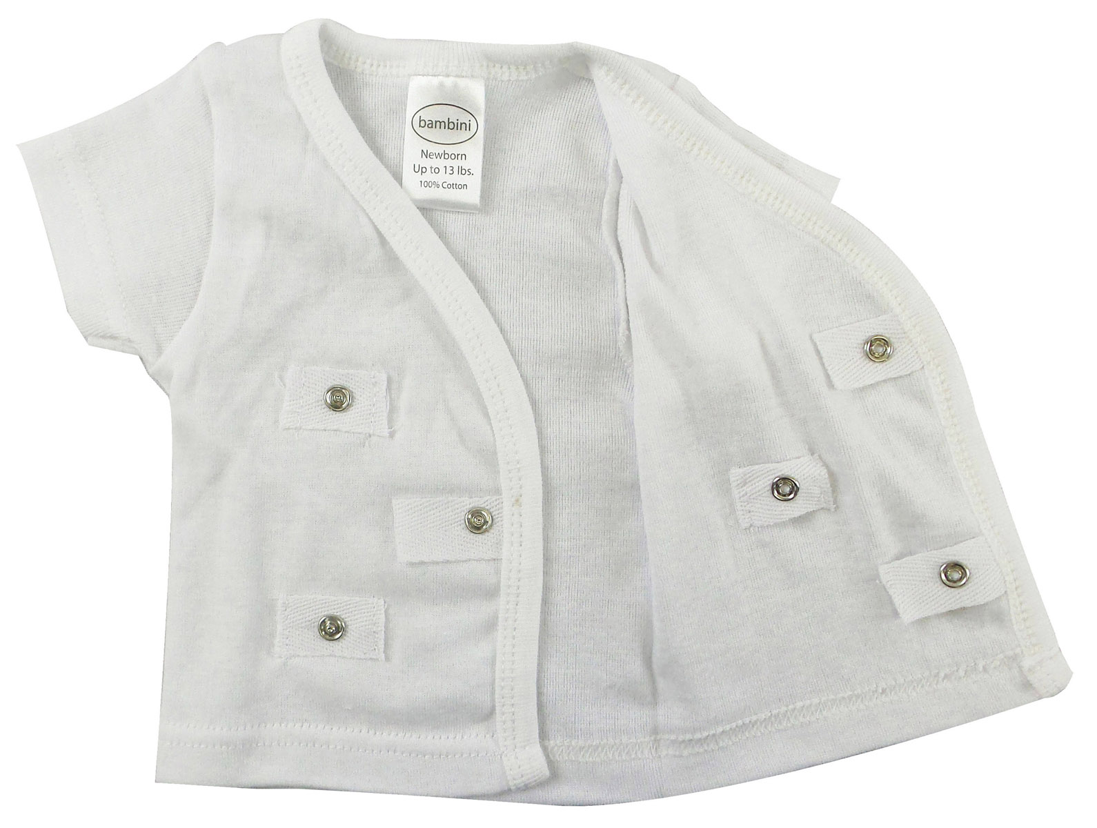 Three white short sleeve side-snap shirts for babies, showcasing soft cotton fabric and mitten cuffs.