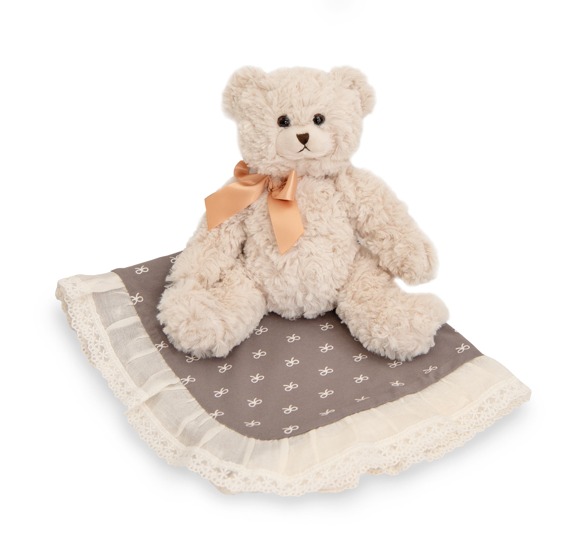 Winter Pearl Blanket Gift Set featuring soft grey blanket, matching cap, delicate lace, and a cute plush toy.