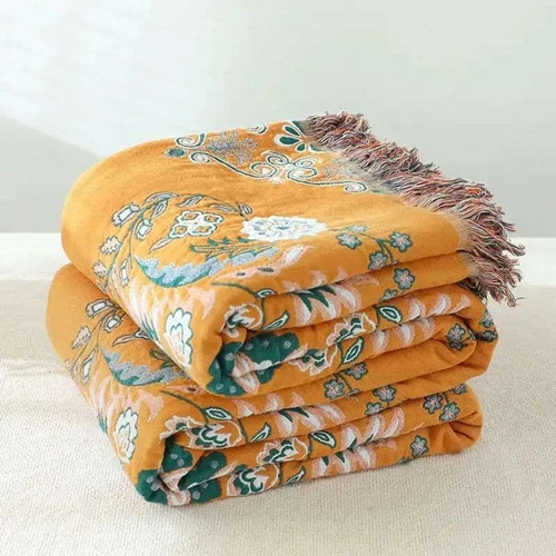 The Cotton Gauze Fringed Throw Blanket features a stunning European-style design that is both elegant and chic. Its vibrant yellow-orange hue adds a pop of color to any room, making it a perfect statement piece for your living space. The fringed detailing not only enhances its aesthetic appeal but also adds a touch of bohemian flair, making it suitable for various decor styles.