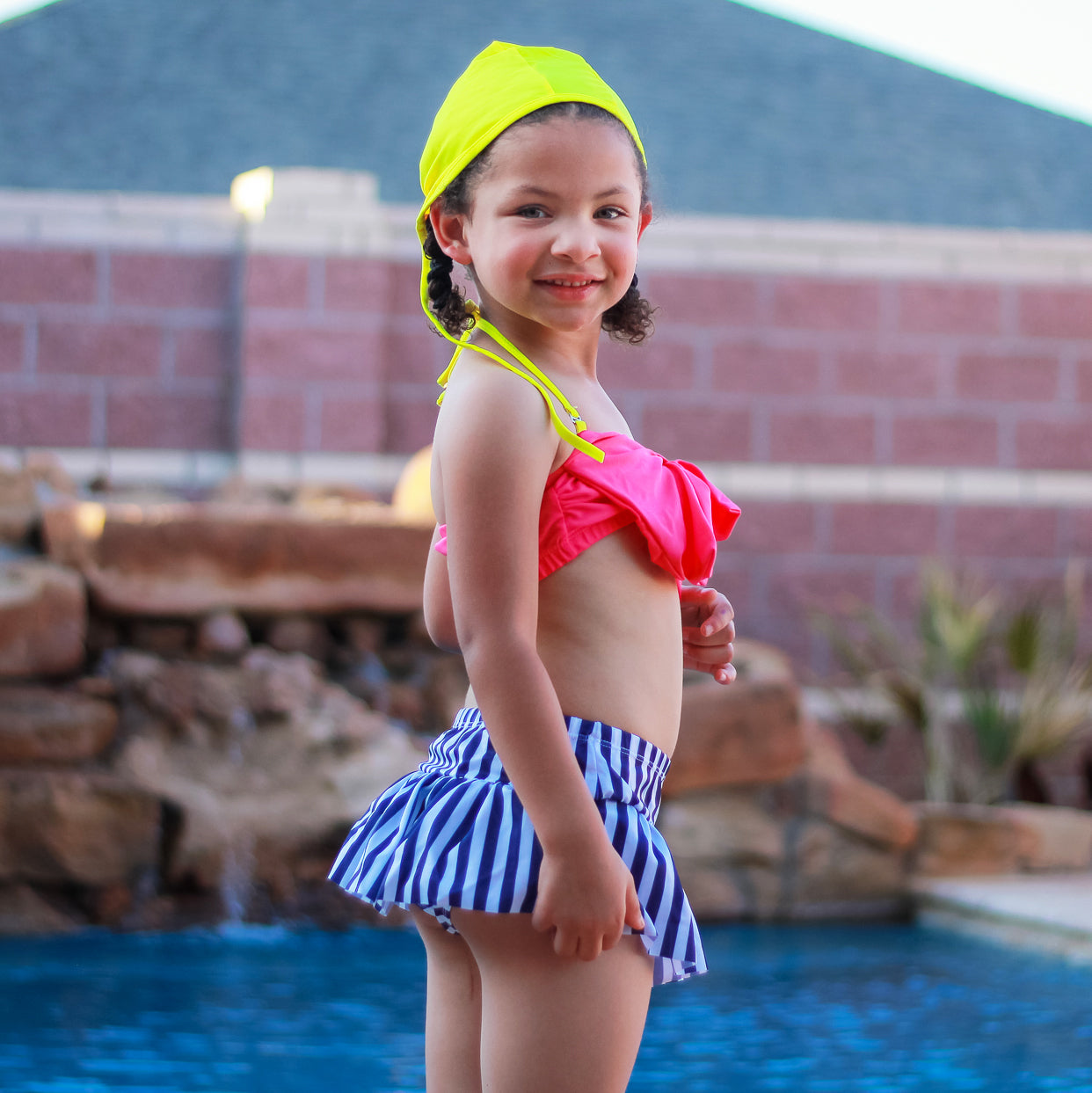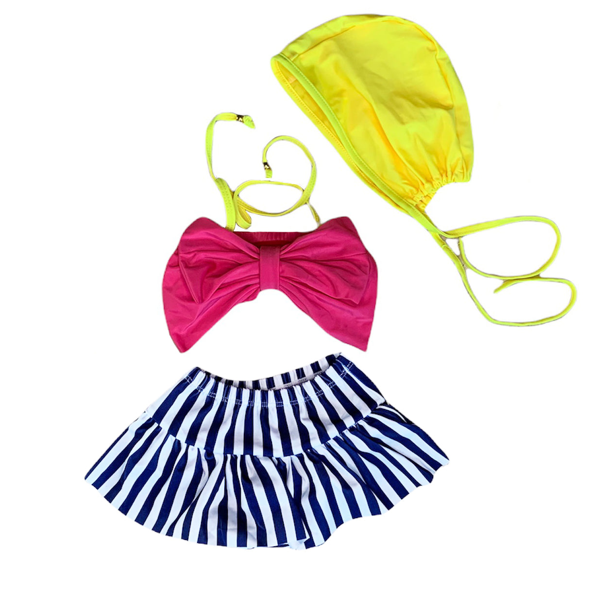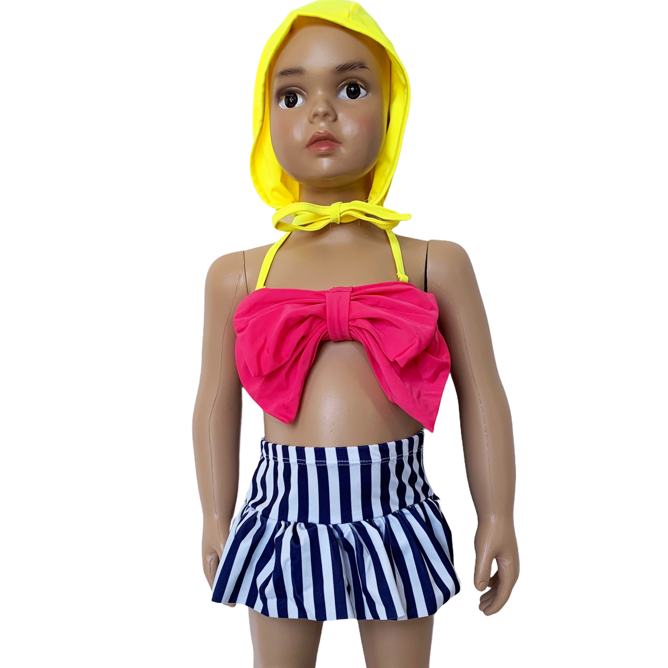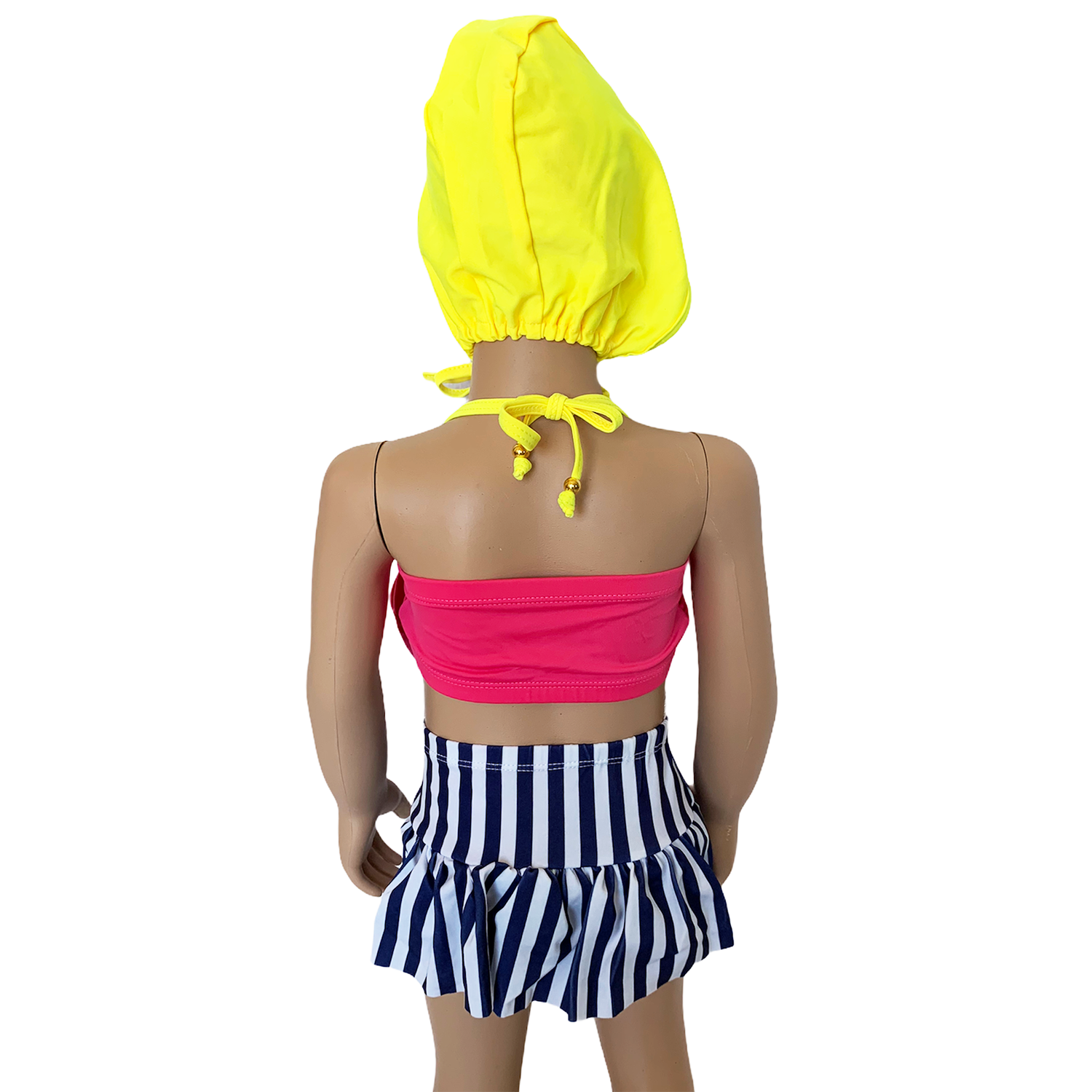 AL Limited Girls 3-piece striped skirt hot pink bathing suit with bandeau top and yellow bathing cap.