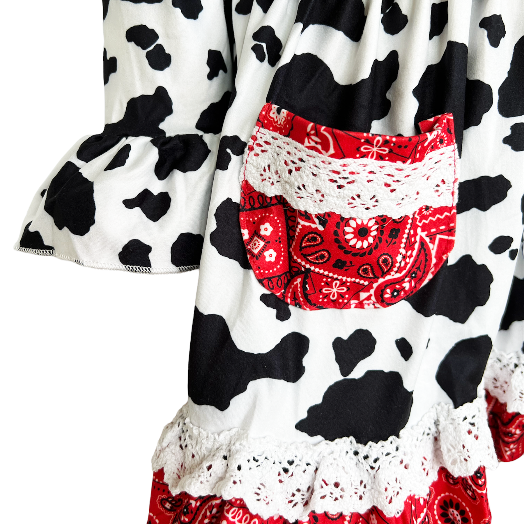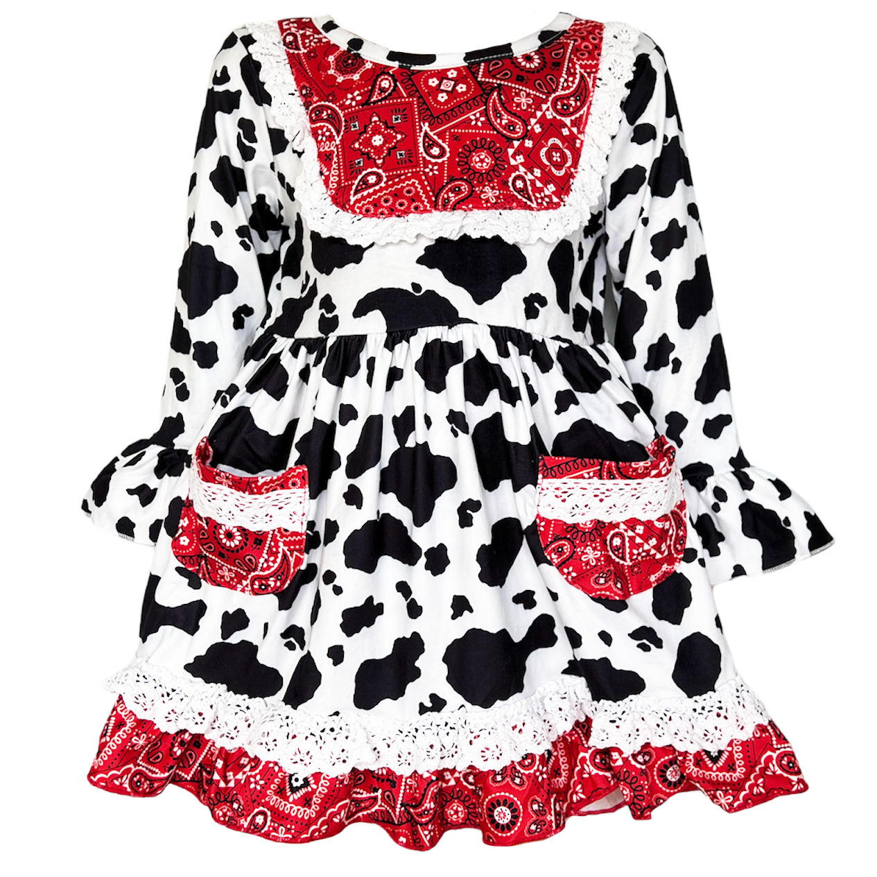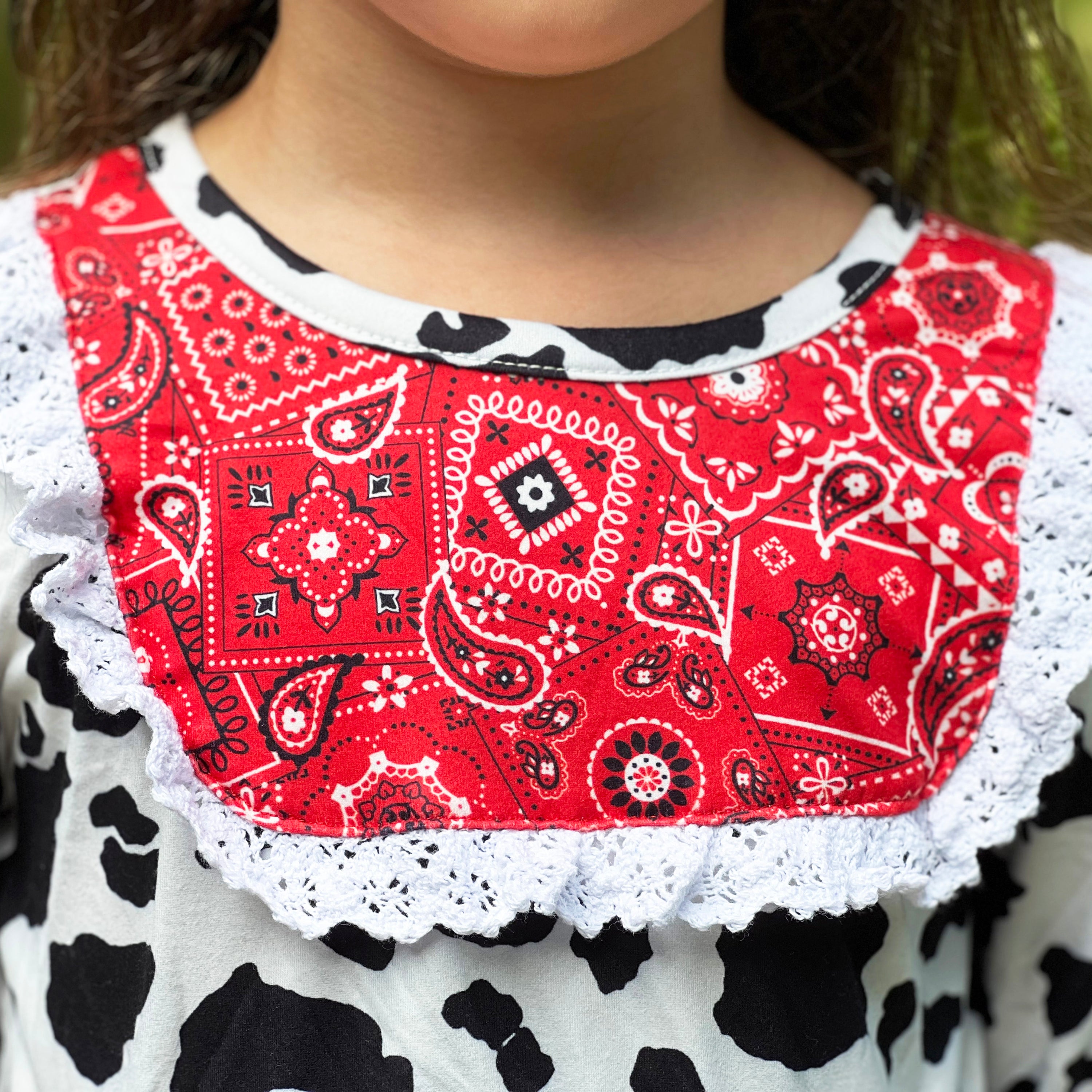 Introducing the AL Limited Girls Boutique Cowgirl Dress, a delightful addition to any young girl's wardrobe. This charming dress features a playful cow print that is sure to capture attention at any event. The vibrant red bandana trimming adds a fun and stylish touch, making it perfect for rodeo parties, dress-up occasions, or even casual school days. With its unique design, this dress is not just a piece of clothing; it's a statement of fun and creativity.