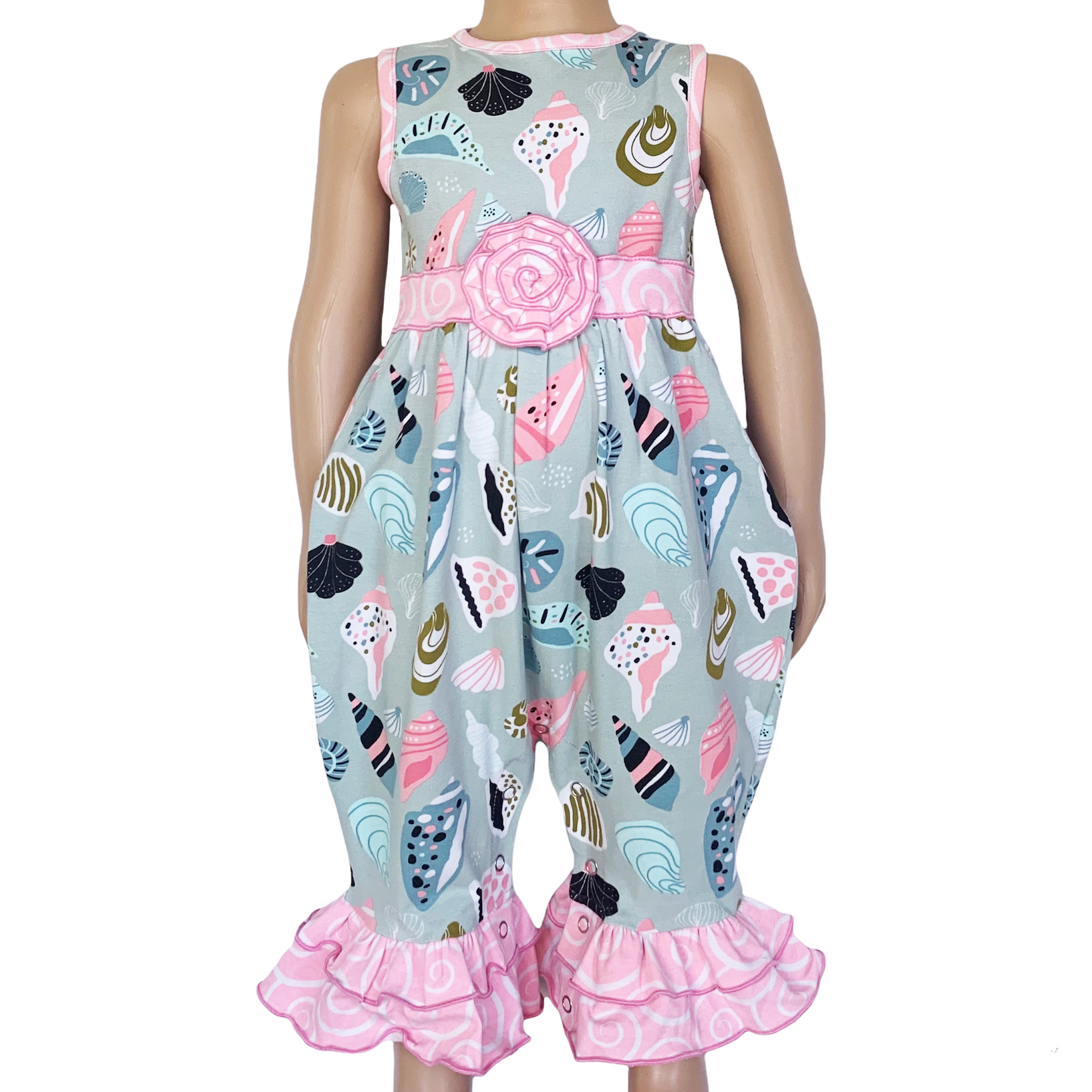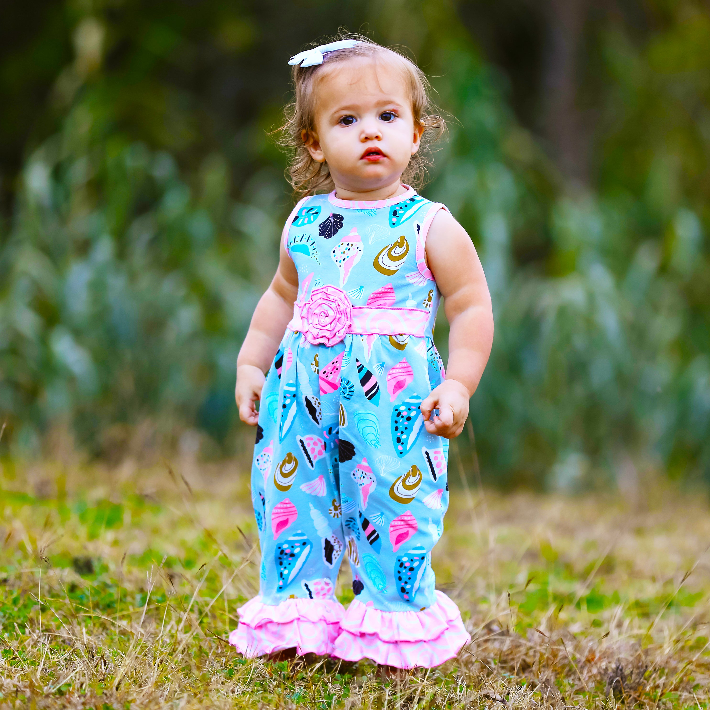 The AnnLoren romper showcases a beautiful nautical seashells pattern that is both playful and elegant. The pink swirl fabric trim around the neckline and the ruffles on the rose and pant legs add a touch of femininity, making this outfit perfect for special occasions or everyday wear. Your baby girl will look adorable in this stylish romper, whether at a family gathering or a day at the park.