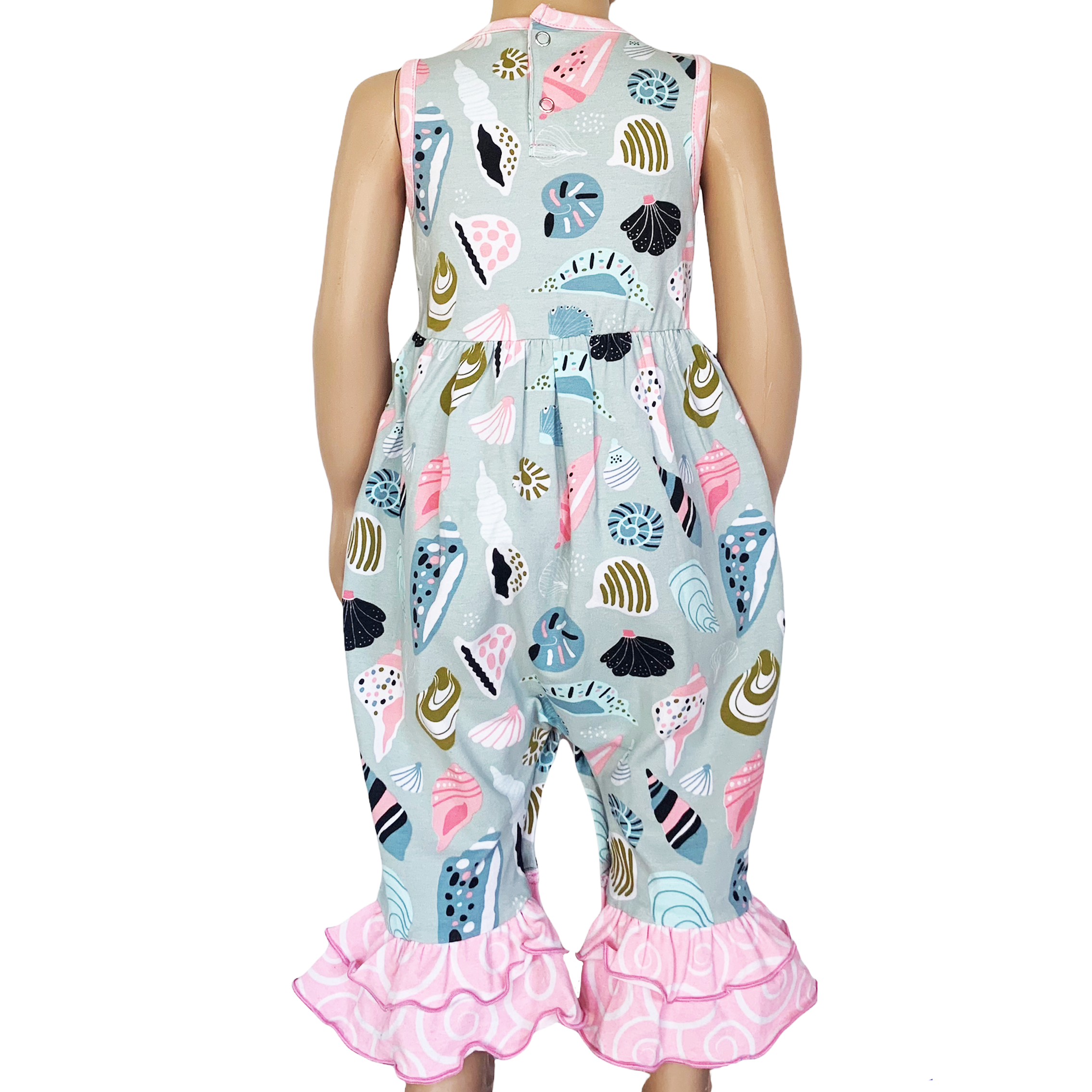 AnnLoren Baby Girls' Nautical Seashells Romper featuring seashells pattern and pink swirl trim.