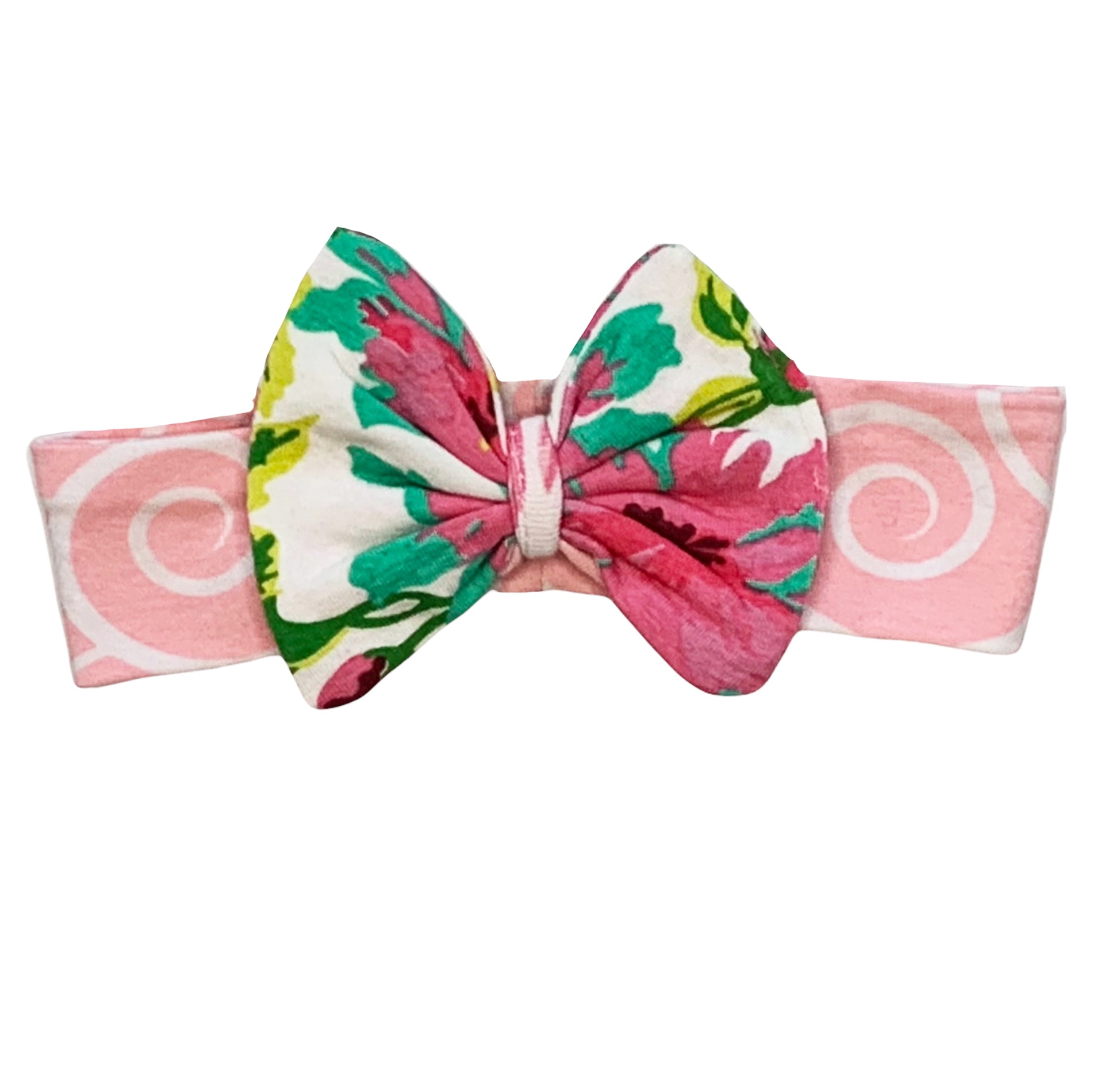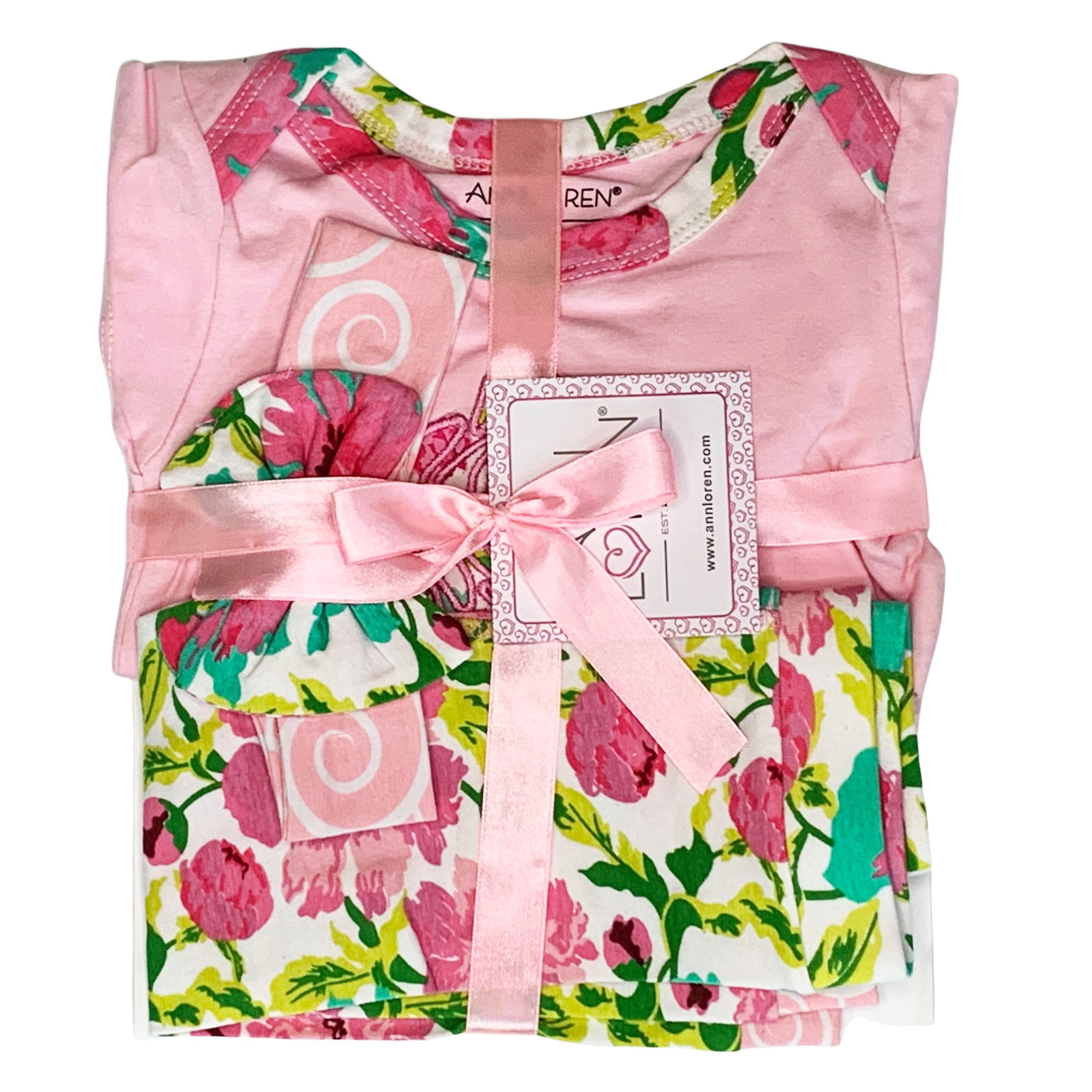 AnnLoren Baby Girls Layette set featuring a pink floral onesie, matching pants, and a headband, perfect for stylish infants.