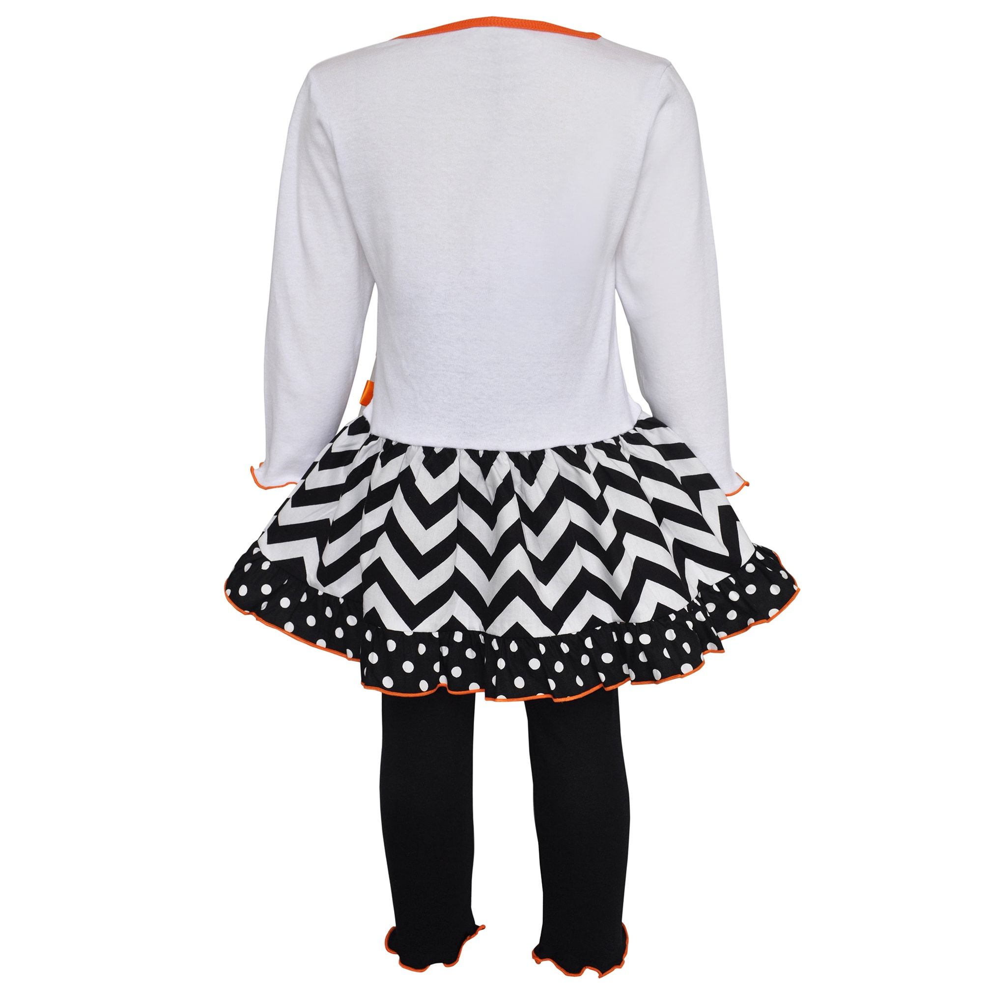 The long-sleeved top features decorative details that enhance its charm. The kitten applique adds a whimsical touch, while the black-and-white chevron pattern on the skirt provides a trendy contrast to the bright orange bow. This combination of colors—black, white, and orange—captures the spirit of Halloween perfectly, making it a festive choice for your little girl.
