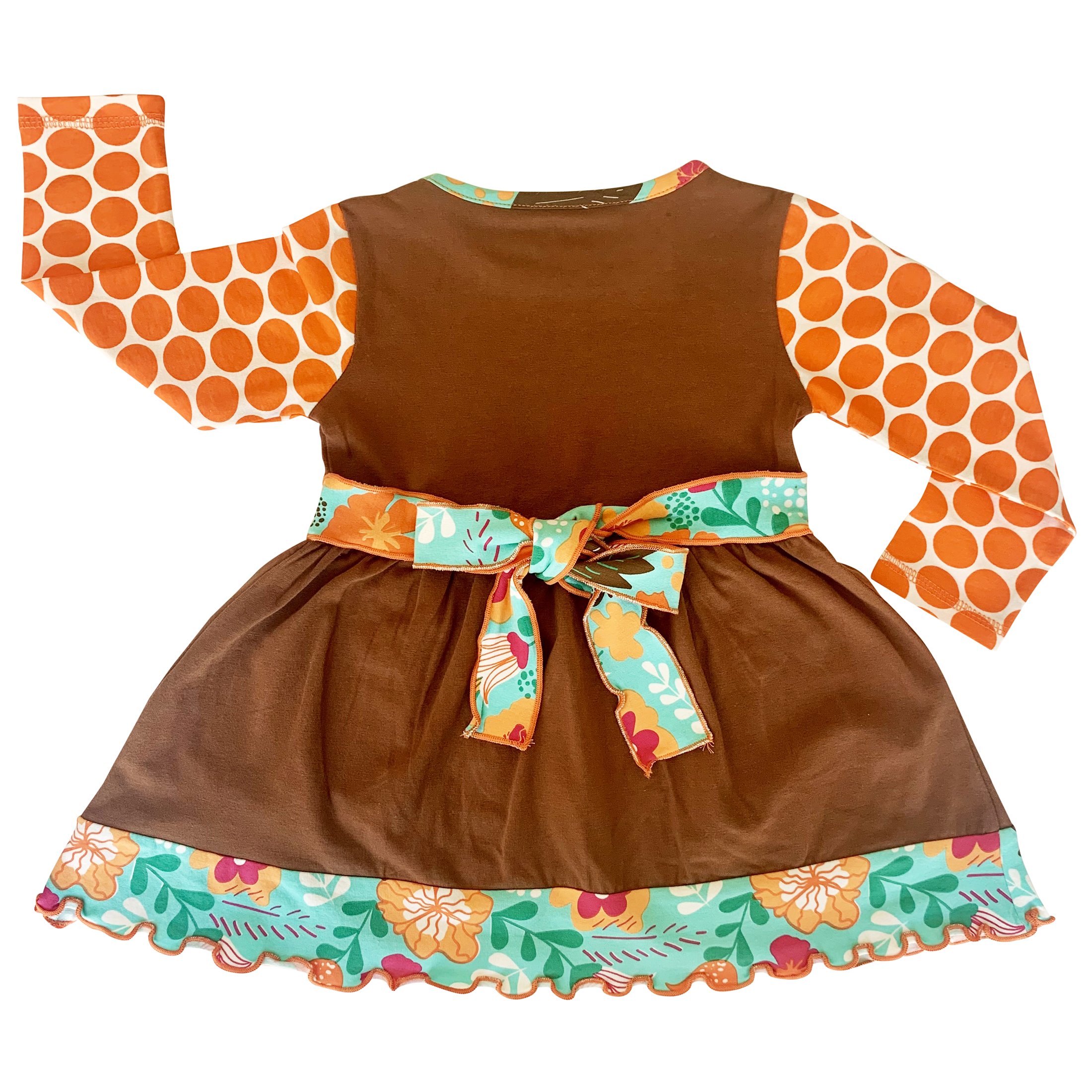 One of the standout features of this dress is the vibrant teal floral sash that ties behind the waist in a big bow. This detail not only enhances the overall look of the dress but also allows for an adjustable fit, ensuring your little one feels comfortable and stylish. The sash adds a pop of color that beautifully contrasts with the orange pumpkin patches, creating a delightful autumn aesthetic.