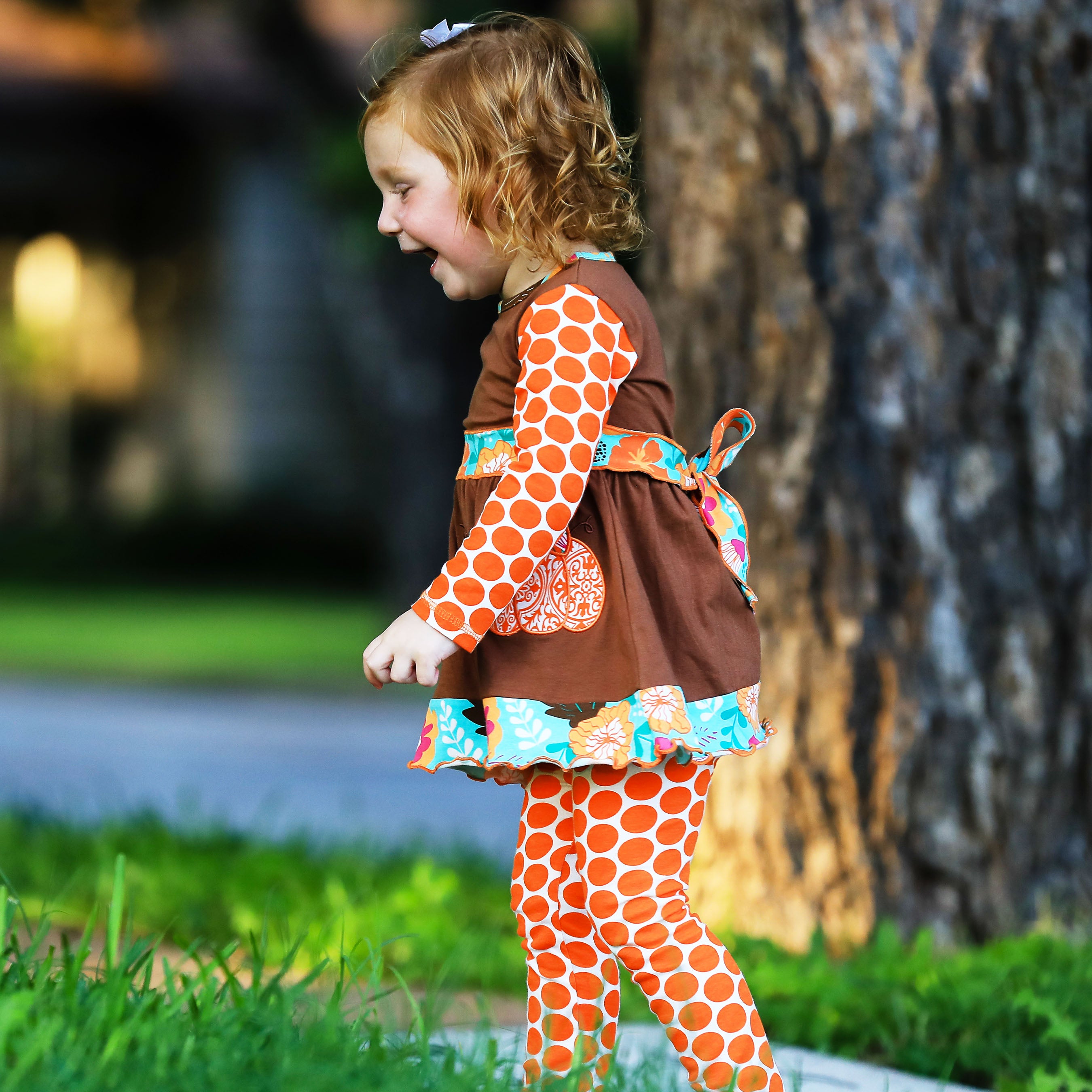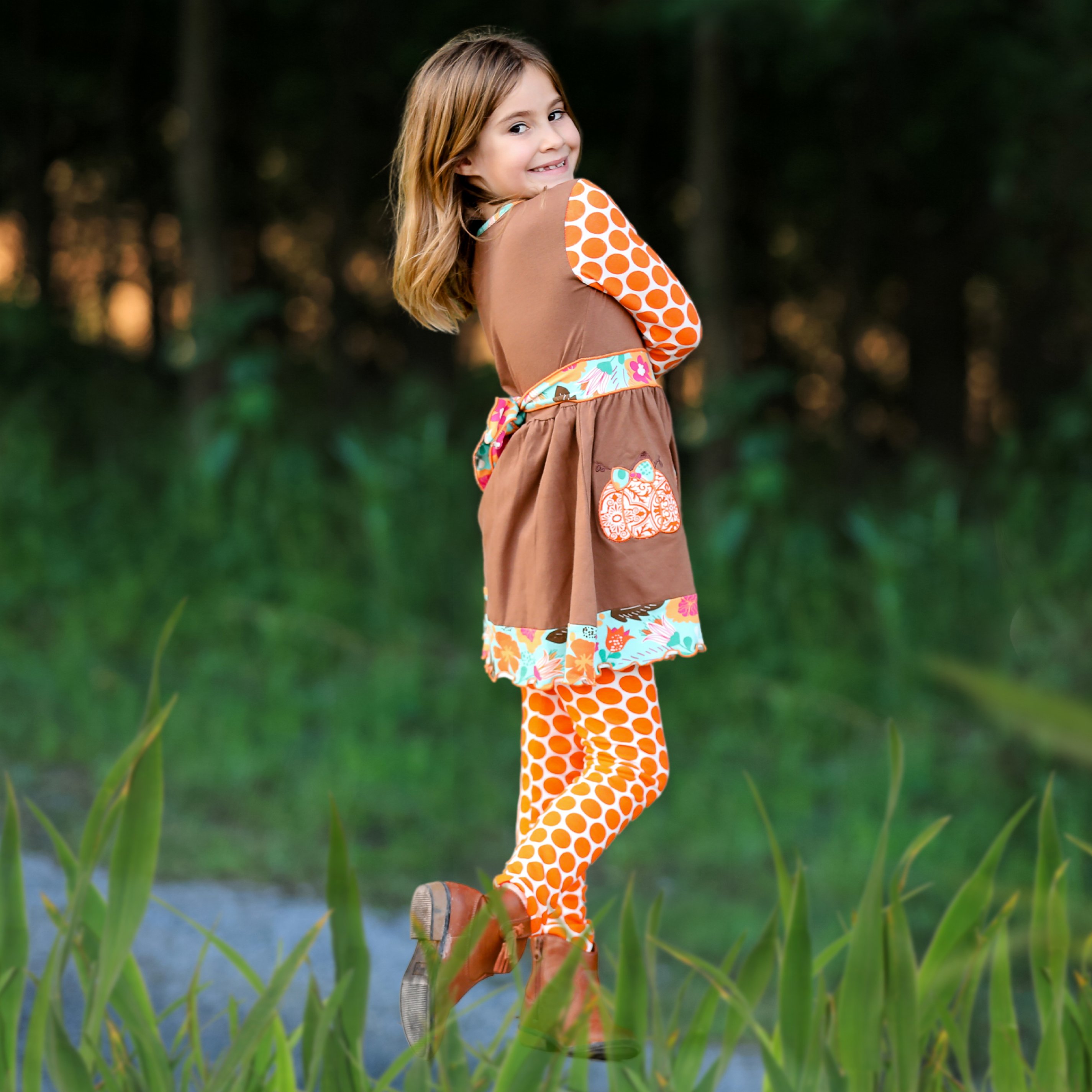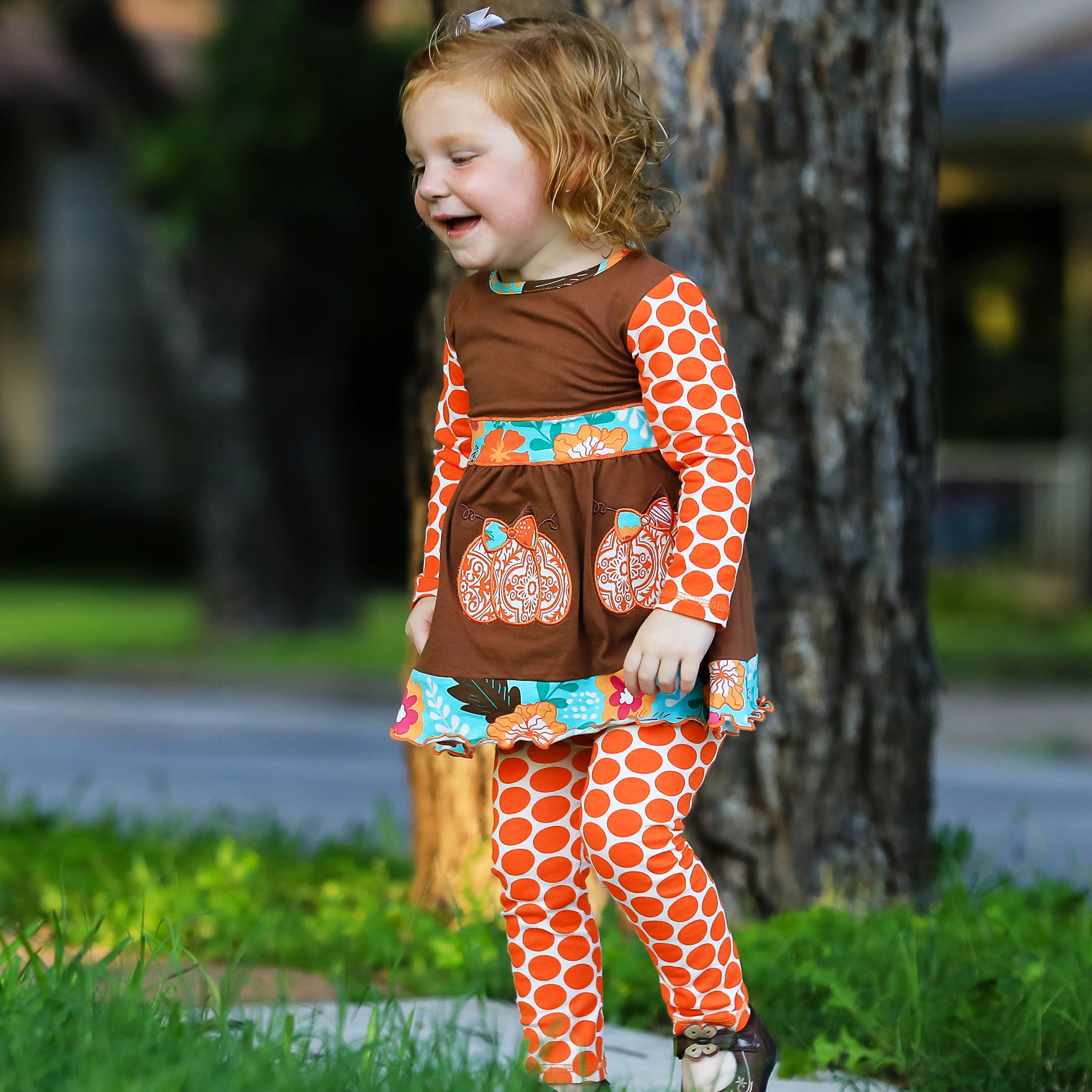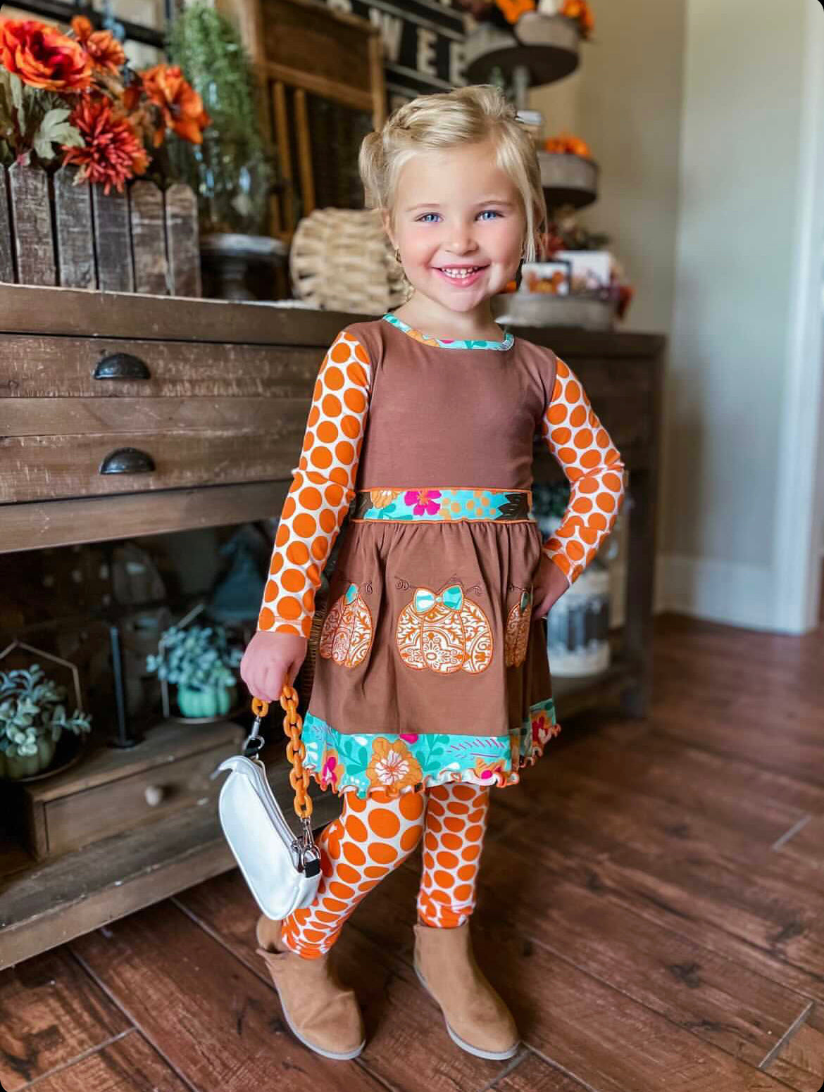 The AnnLoren dress comes with matching orange polka dot leggings that complete the outfit. These leggings feature an elastic waistband, providing a snug yet comfortable fit for active girls. The combination of the dress and leggings makes it easy for your child to play and explore while looking adorable. The leggings also add an extra layer of warmth, making this outfit perfect for chilly fall days.