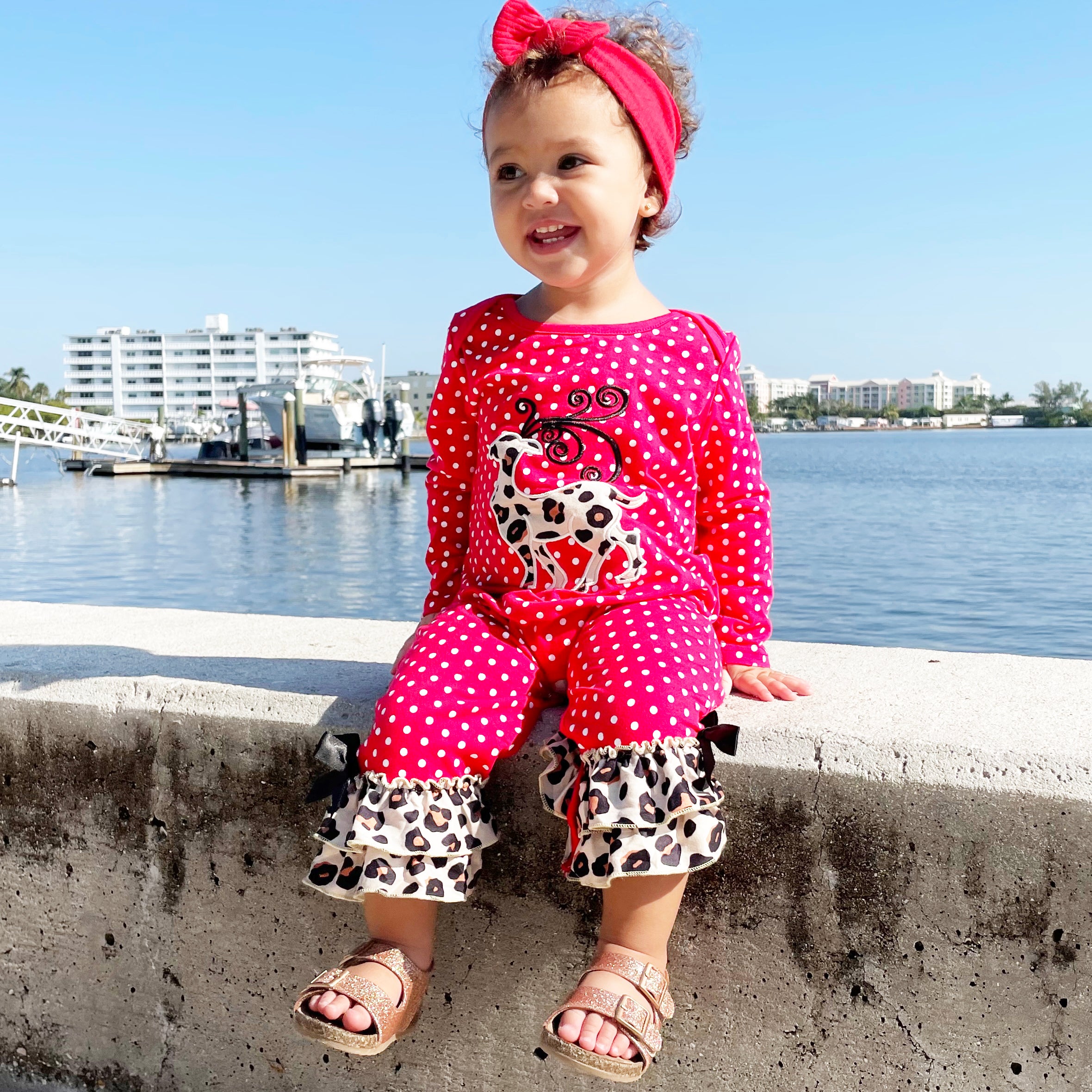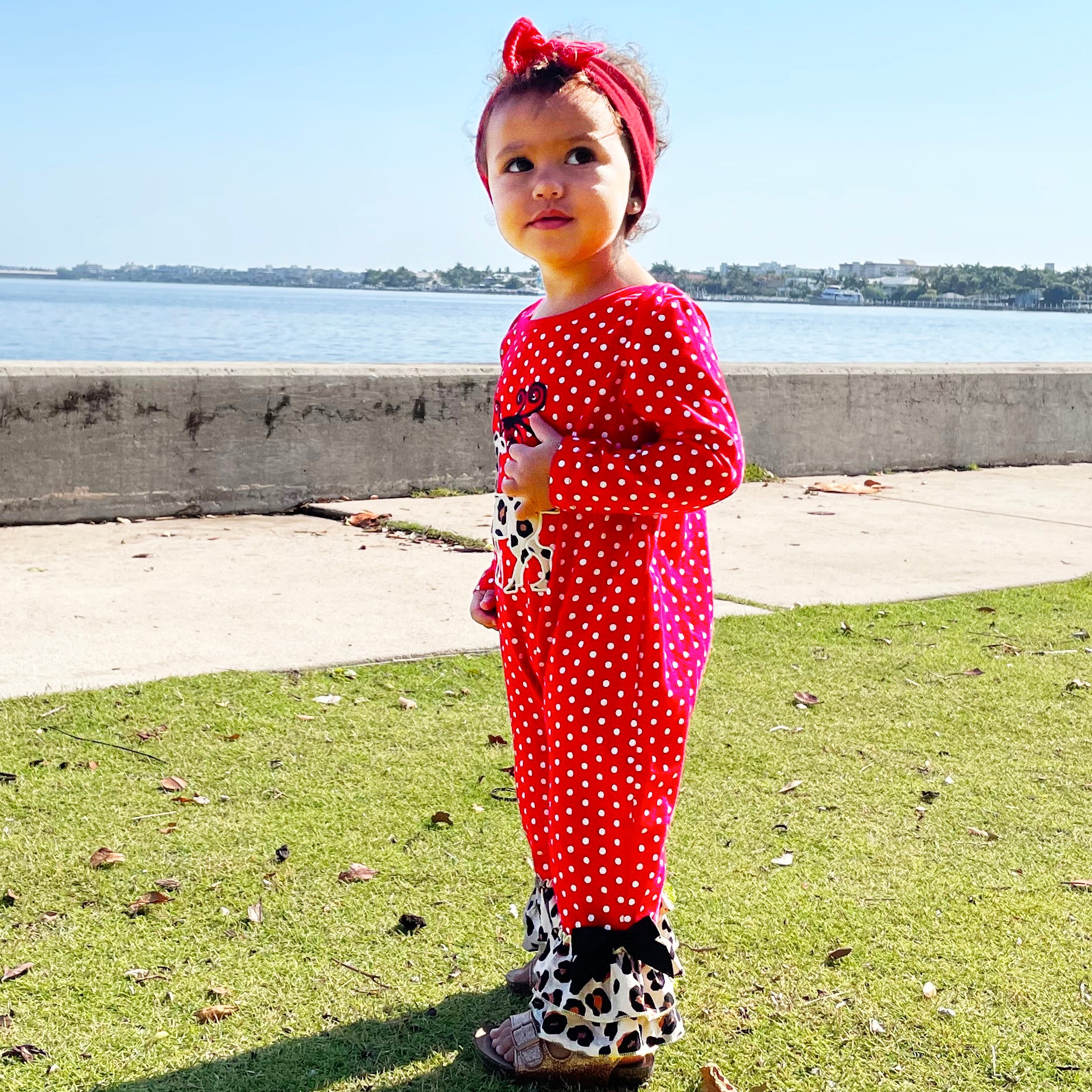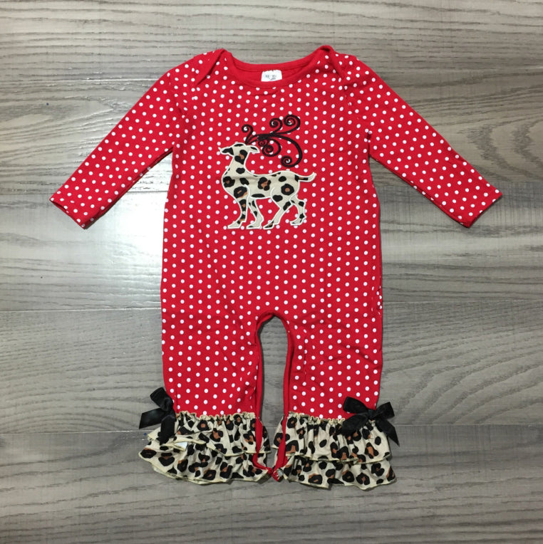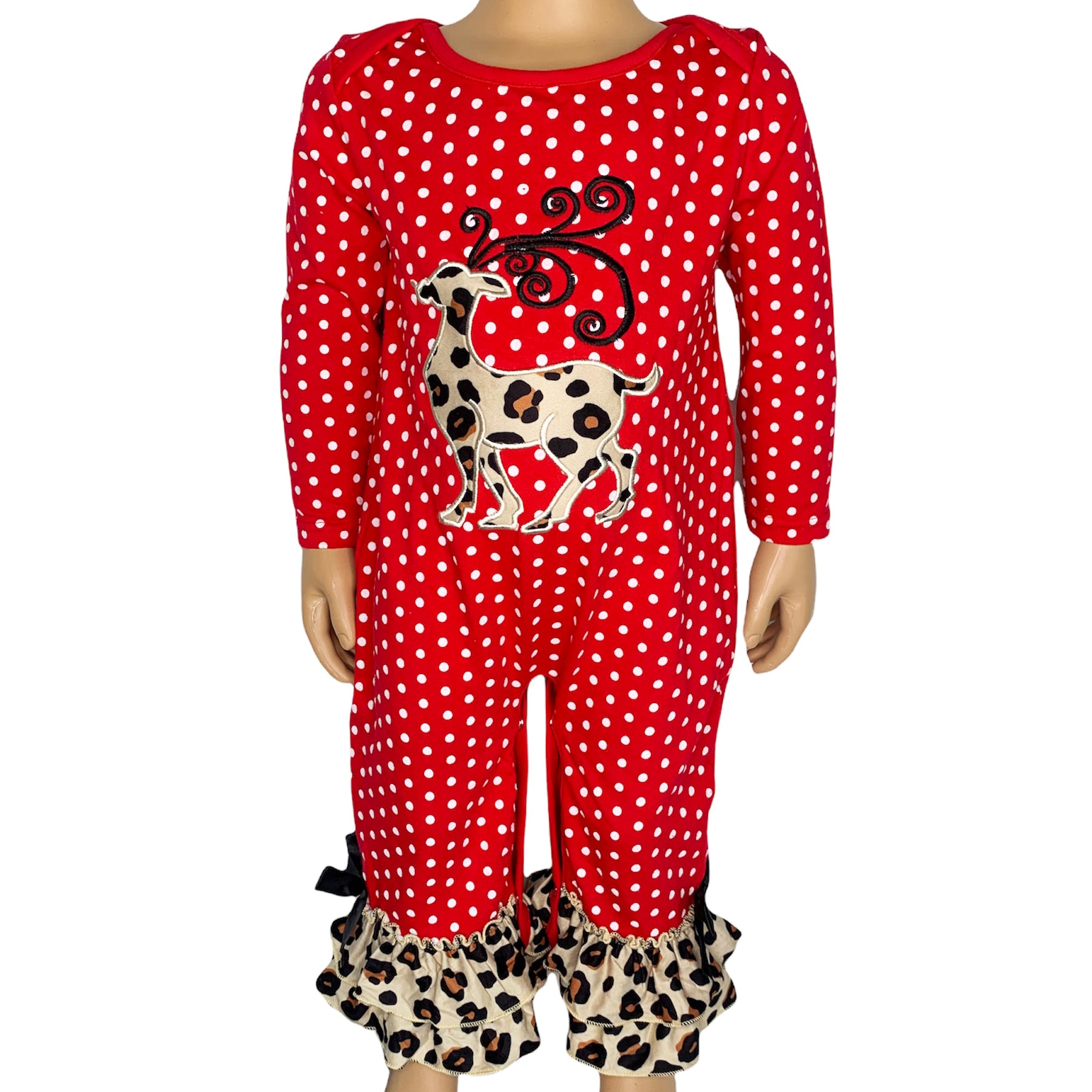 The standout feature of this romper is the adorable reindeer applique, which captures the essence of the holiday season. Your baby will look absolutely precious in this outfit, whether it's for family gatherings, holiday photos, or simply spreading cheer. The leopard ruffles on the pants give it a unique twist, ensuring your little one stands out in any crowd.