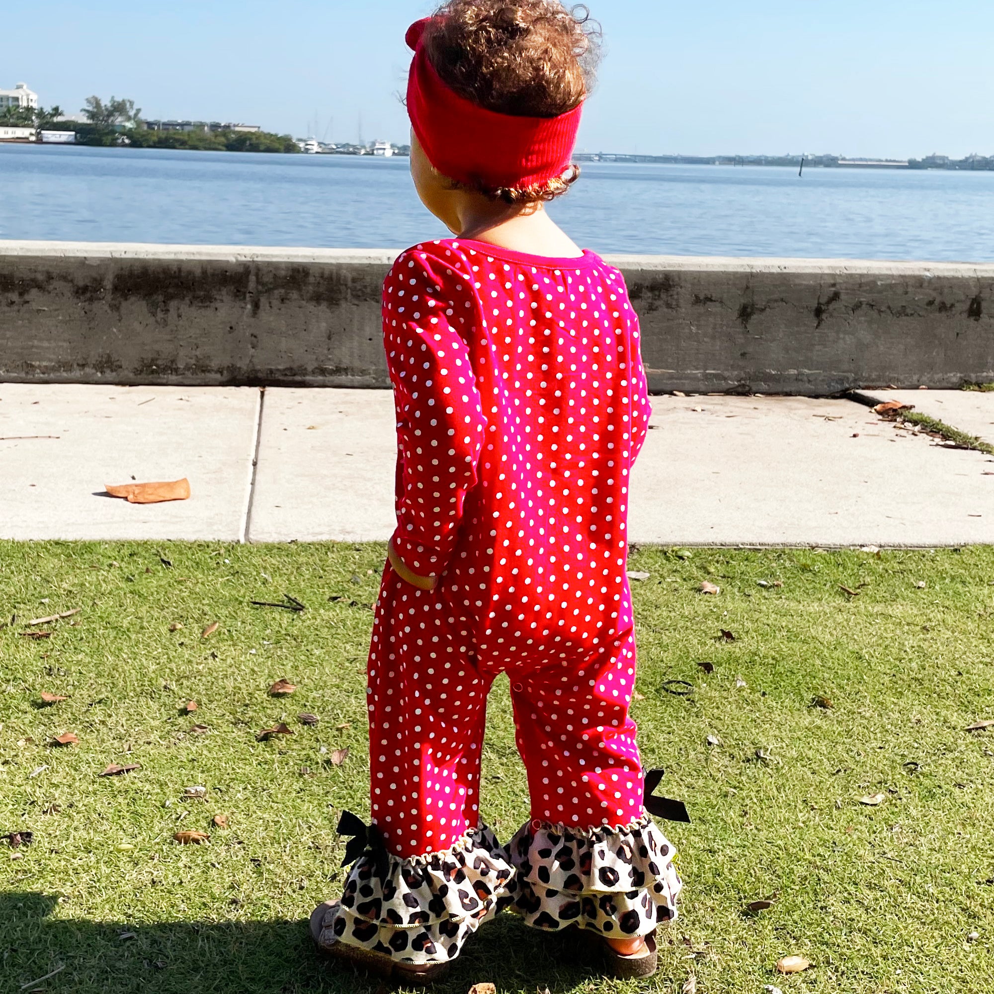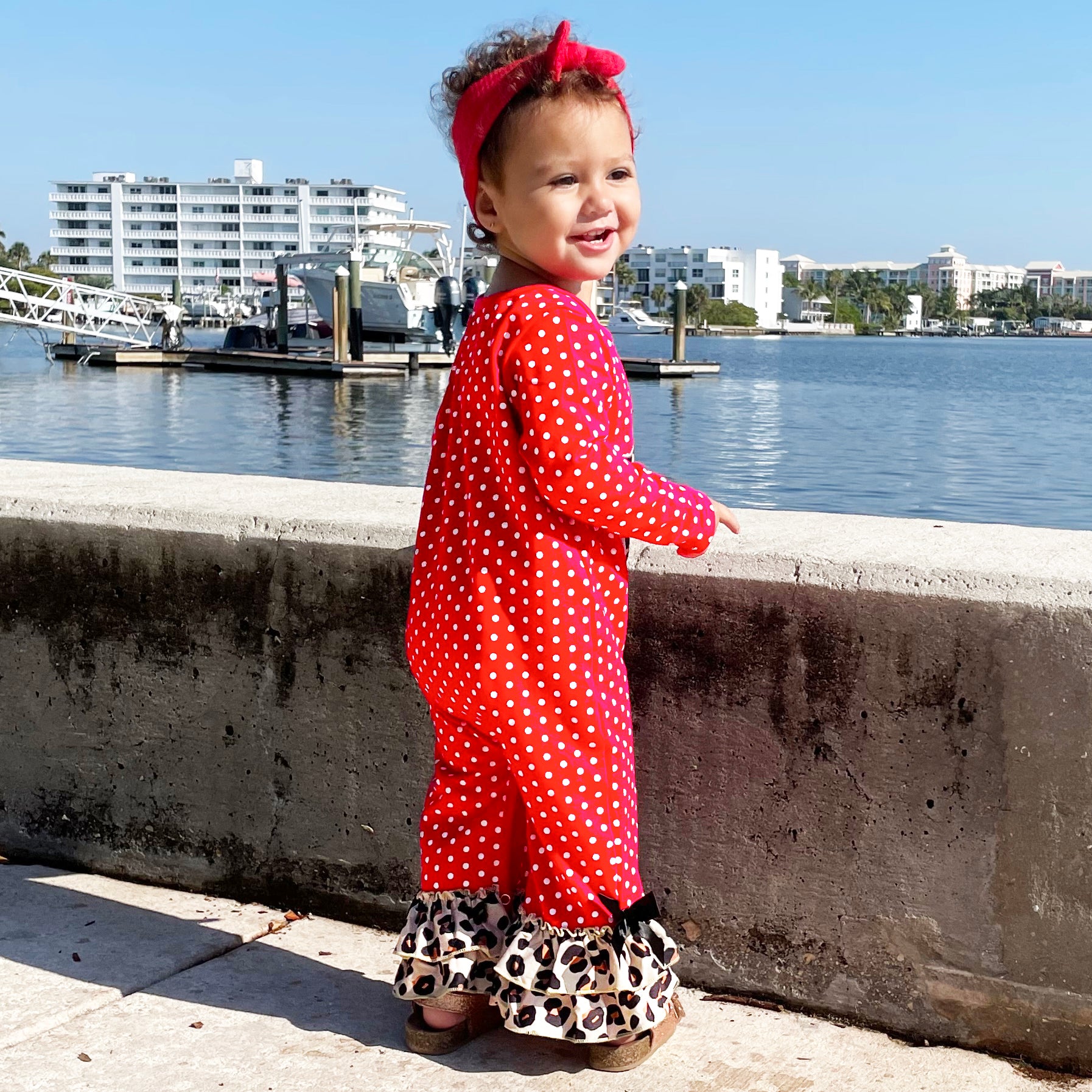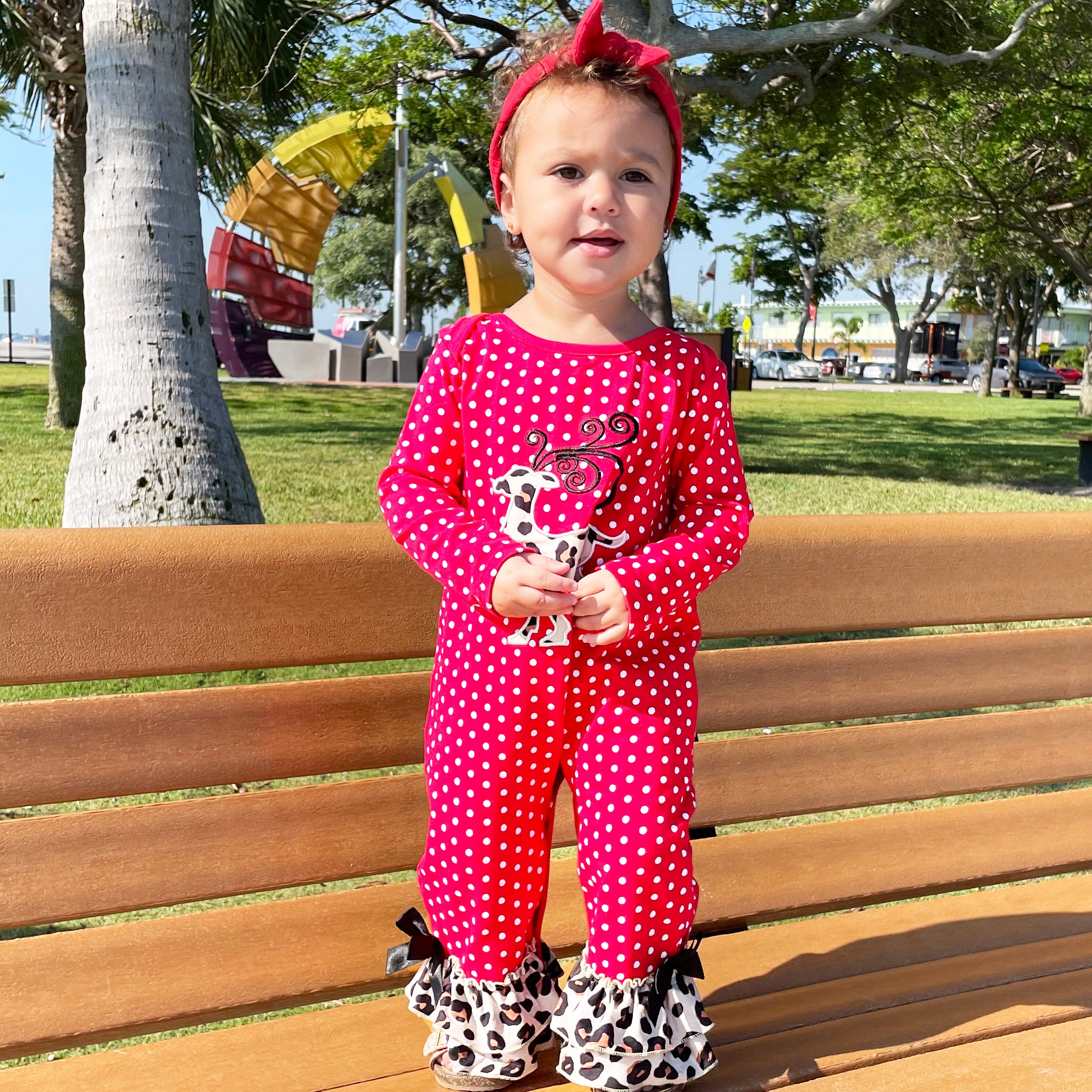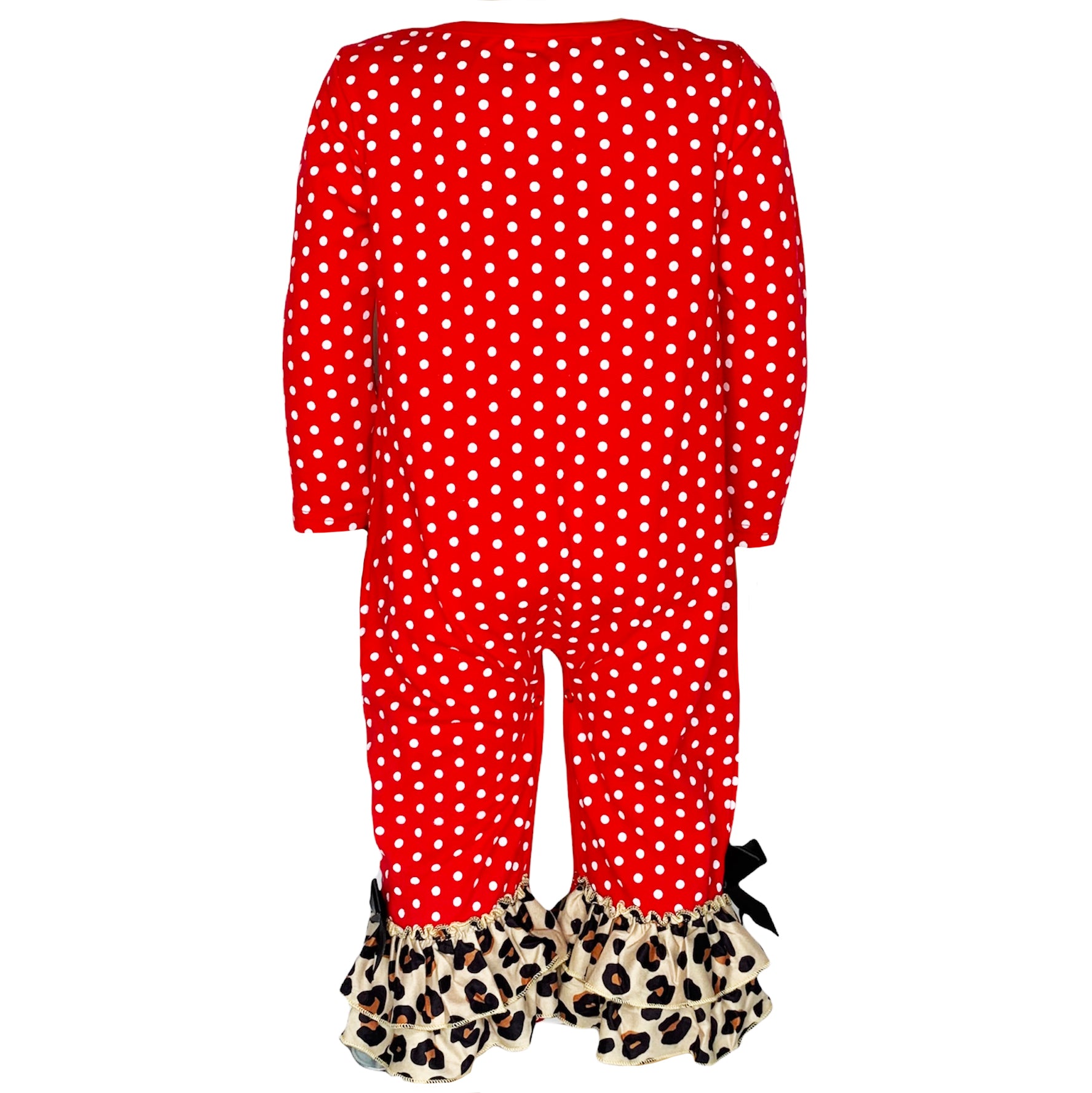 Get your little girl ready for the festive season with our Baby Girls Christmas Leopard Reindeer Holiday Cotton Romper One Piece. This charming romper combines holiday spirit with trendy fashion, making it a must-have for any baby girl's wardrobe. The vibrant red color is perfect for Christmas celebrations, while the playful leopard ruffles add a touch of fun and style.