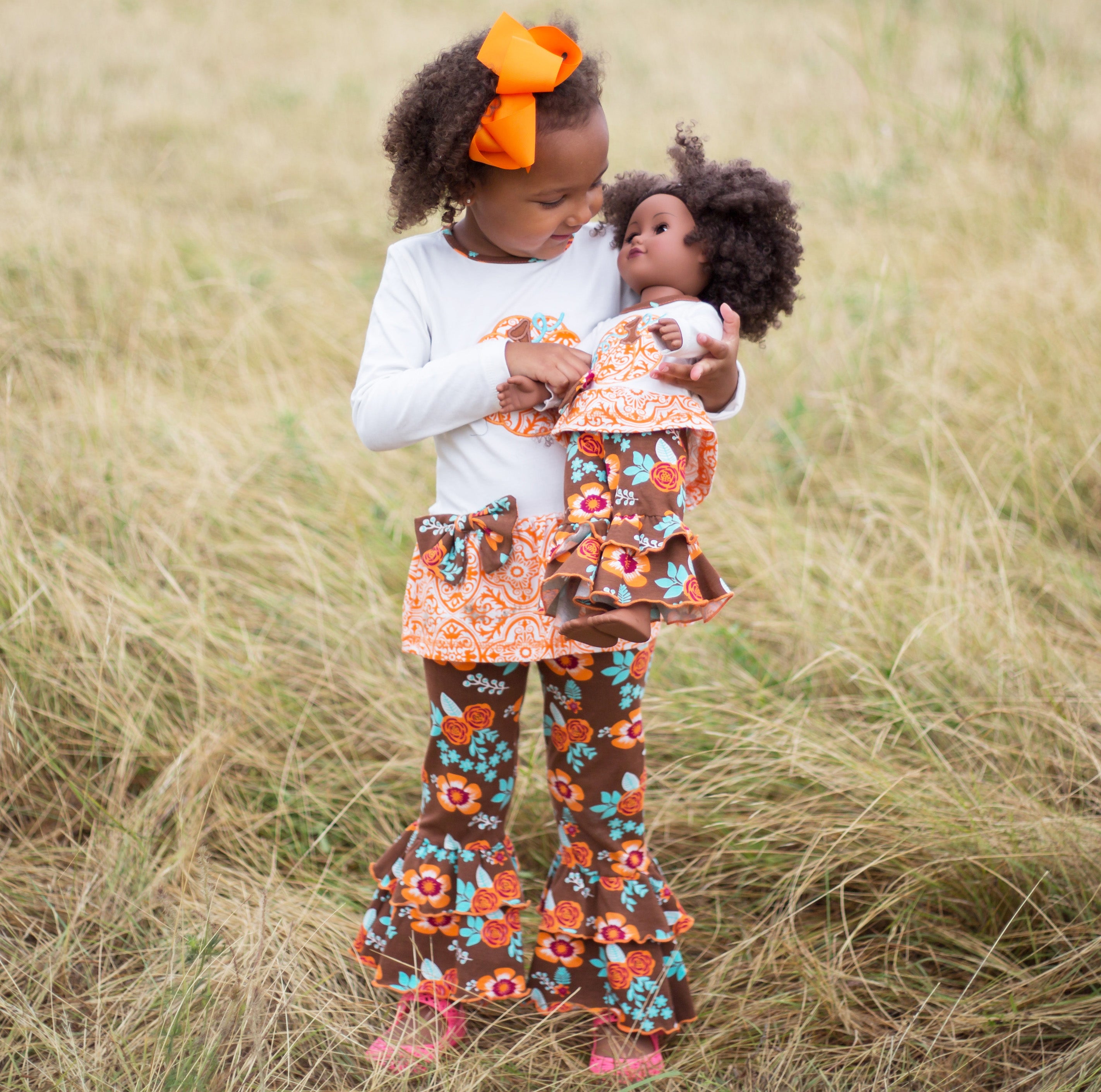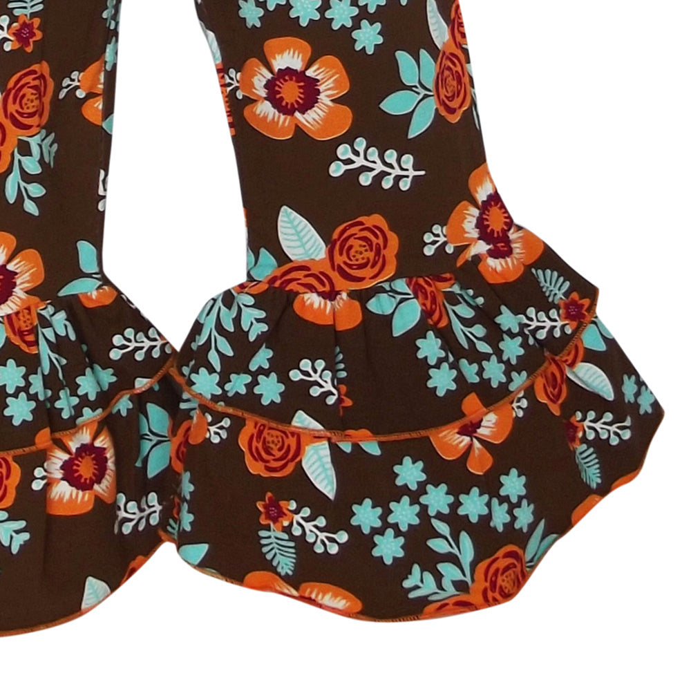 The tunic is complemented by a beautiful orange damask ruffle that adds a touch of elegance to the outfit. The autumn floral knit pants are designed with a ruffled bottom, providing a playful and fashionable look that your little girl will love. The combination of the tunic and pants creates a cohesive outfit that is perfect for family gatherings, school events, or casual outings during the fall.