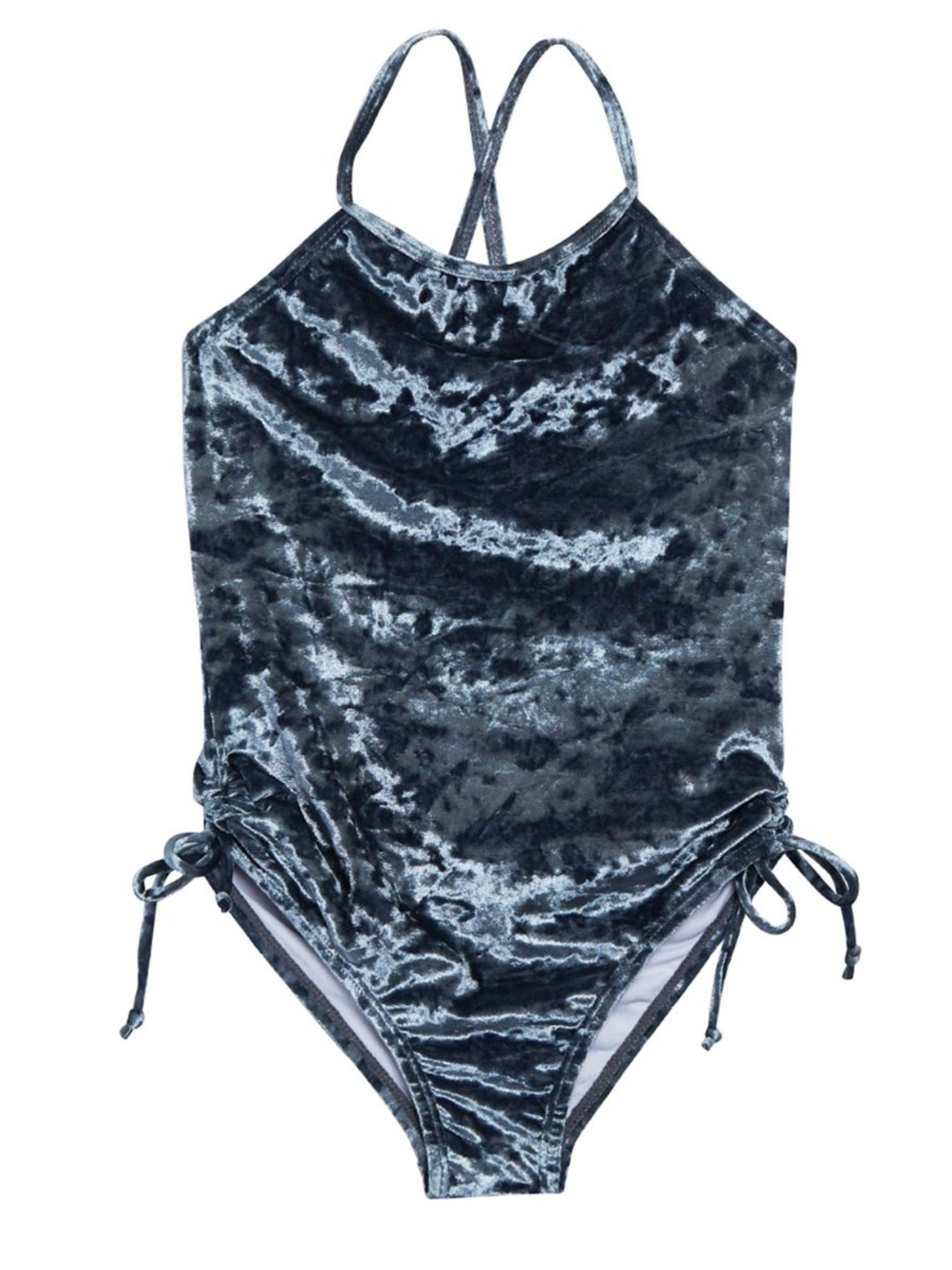 Introducing the EMILIYA - Crushed Velvet One Piece Swimsuit from Limeapple, a perfect blend of style and comfort for young girls aged 4 to 16. This stunning swimsuit is crafted from luxurious crushed teal velvet, making it not only visually appealing but also incredibly soft against the skin. The adjustable crossover straps ensure a perfect fit, allowing for ease of movement whether at the beach or poolside.