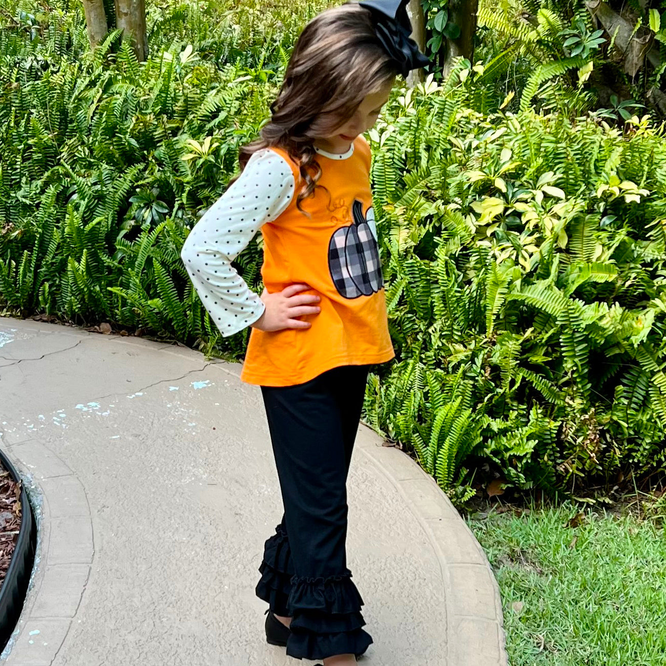 Girls orange pumpkin top with black ruffle pants, perfect for Halloween and Thanksgiving, featuring polka dot sleeves and plaid pumpkin applique.