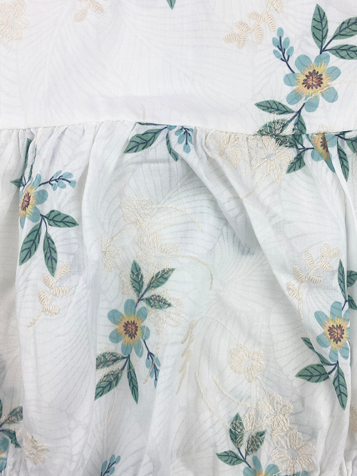 The Maeve embroidered onesie is a stunning addition to your baby's wardrobe, designed with both style and comfort in mind. This onesie features a beautiful white on white floral base print adorned with delicate green flowers and cream embroidery, making it a truly unique piece. The intricate details of this onesie are what set it apart, ensuring your little one stands out in any setting.