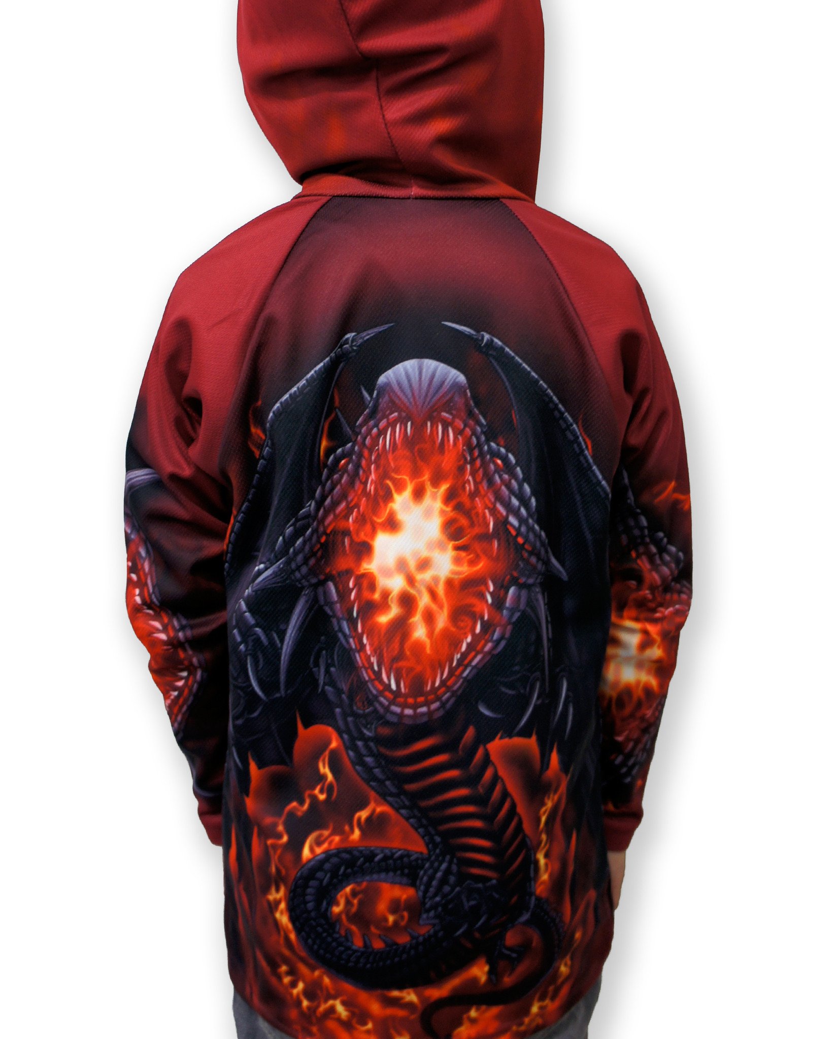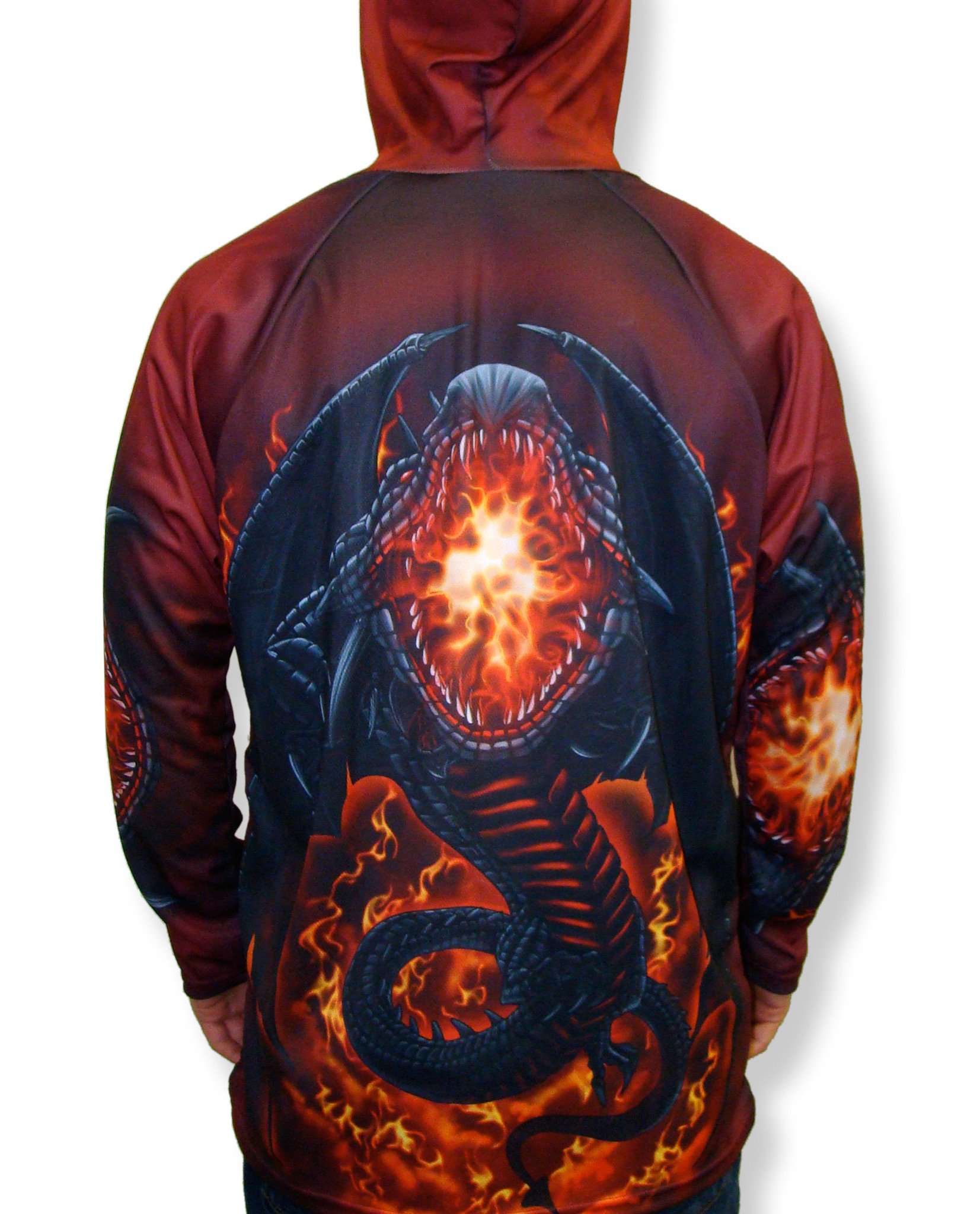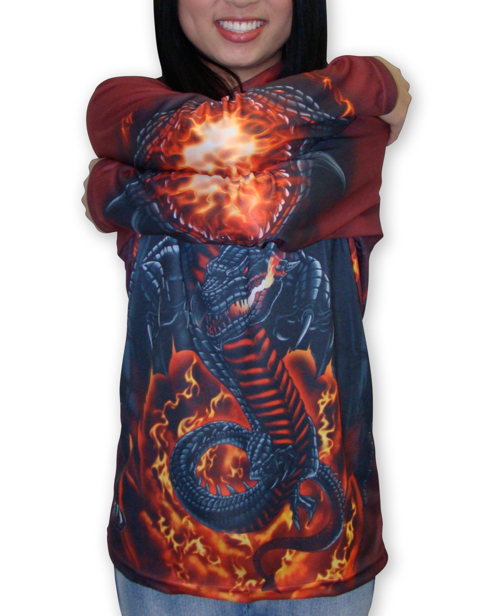 Introducing the ROARING DRAGON Hoodie Sport Shirt by MOUTHMAN®, a truly unique piece of apparel that allows you to express your fierce personality. This one-of-a-kind hoodie features a stunning fire-breathing dragon graphic on the chest. When you fold your arms across your chest, the design transforms to reveal an open-mouthed dragon that seems to breathe fire right at you! Perfect for those who want to make a bold statement, this shirt is not just a piece of clothing; it's an experience.