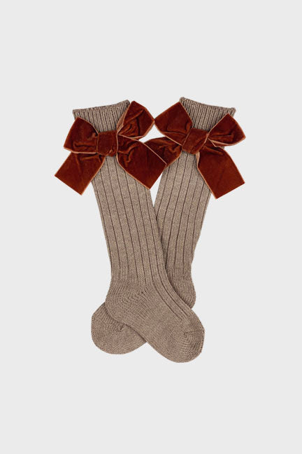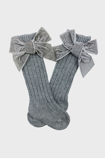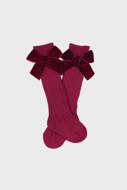 Each pair features a lovely velvet bow attached at the outer leg, making them a standout piece in your child's clothing collection. The ribbed lines down the sock add texture and style, ensuring that your little babe looks adorable while staying cozy. Available in five beautiful colors, you can mix and match these socks with different outfits to create unique looks.
