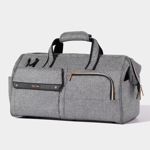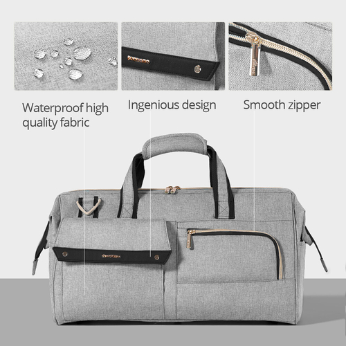 Travel hassle-free with our 3in1 set-Large Capacity Diaper Bag. Eleven pockets, baby clothes organizer, and waterproof food bag for ultimate organization. Water-resistant, three carry options, and smooth zipper. Choose convenience for your baby's essentials. Available in Gray and Green. Perfect for long-distance travel, offering 34L of spacious design.