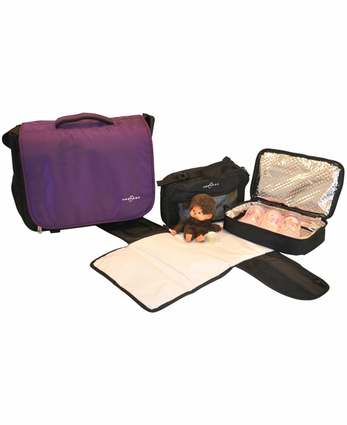 Obersee Madrid Diaper Messenger Bag in Viola, showcasing its spacious design, removable cooler pouch, and ergonomic changing mat.