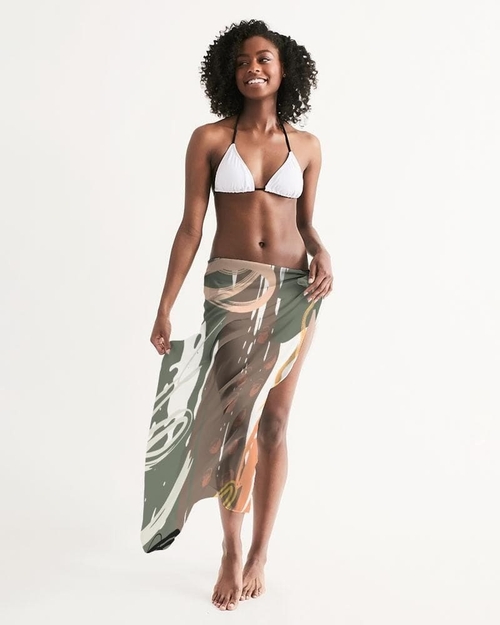 The cover-up features an eye-catching abstract green and peach circular graphic style that is sure to turn heads. The combination of colors is perfect for summer, evoking feelings of warmth and relaxation. The lightweight and flowy fabric allows for easy movement, making it ideal for those sunny days when you want to feel comfortable yet chic.