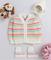 This 3-piece full sleeves sweater set includes a v-neck striped cardigan, cap, and socks in cream, providing warmth and style for little ones.