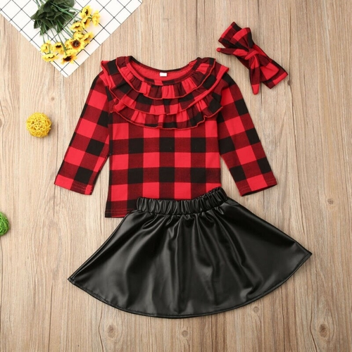 Dropship 3PCS Kids Baby Girls Outfits Plaid T Shirt Tops+PU