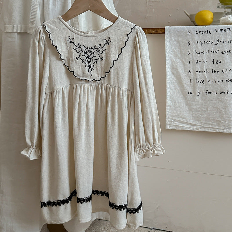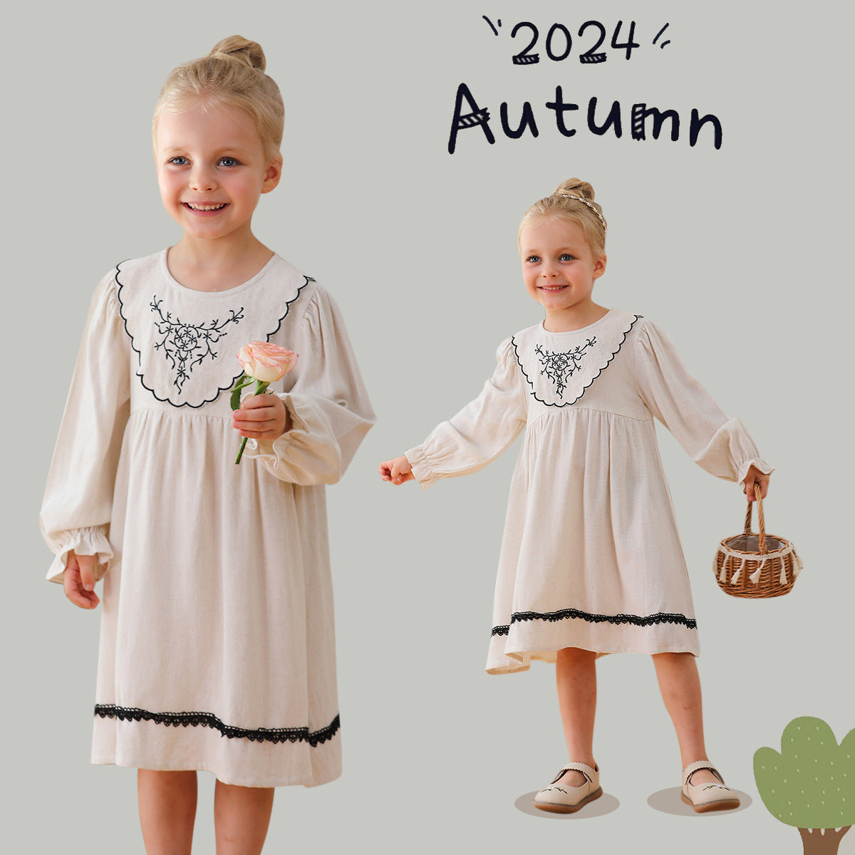 This dress features long sleeves, making it suitable for the transitional seasons of spring and autumn. The khaki color is versatile and can be paired with a variety of accessories and footwear. The embroidered vine pattern adds a unique flair, setting this dress apart from typical children's wear.
