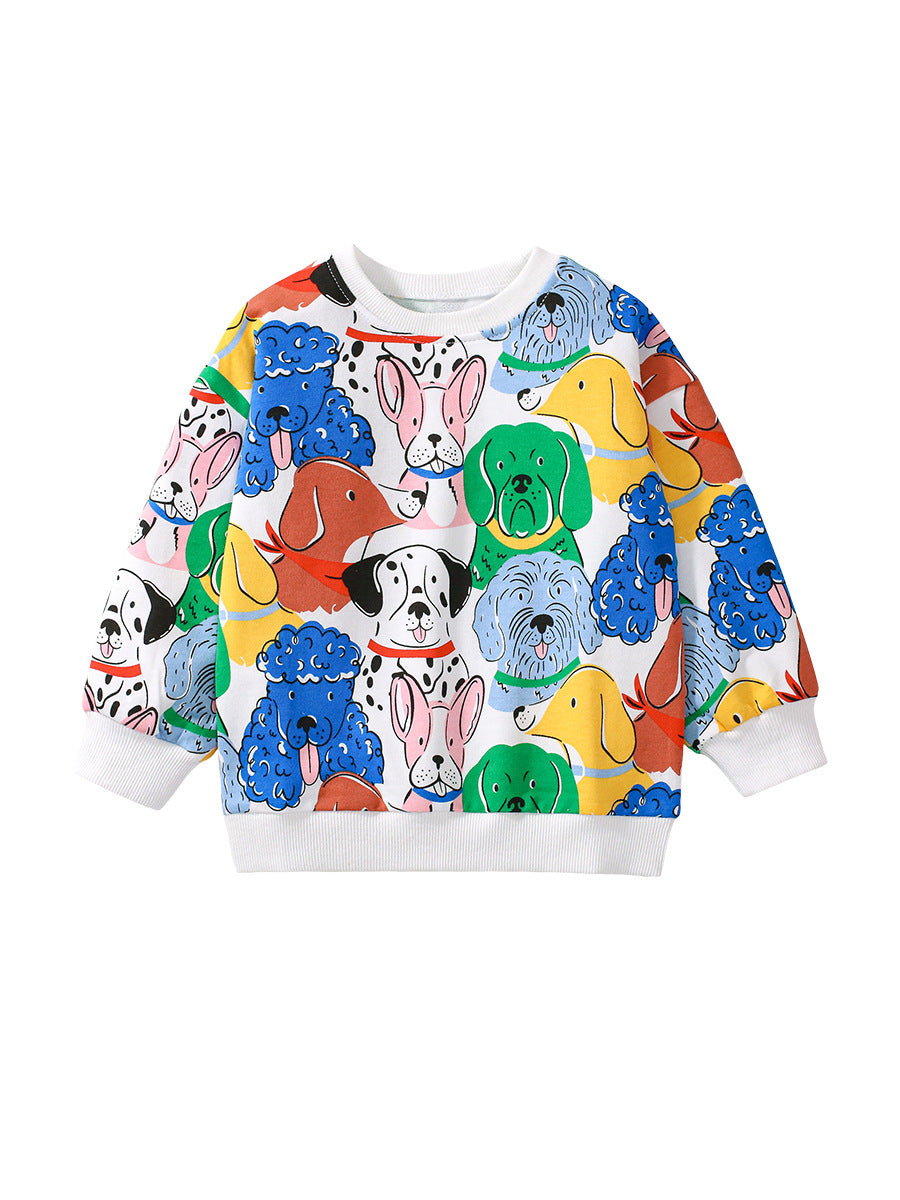 Colorful pullover for baby girls featuring a playful dog print, made from soft cotton, ideal for spring and autumn wear.