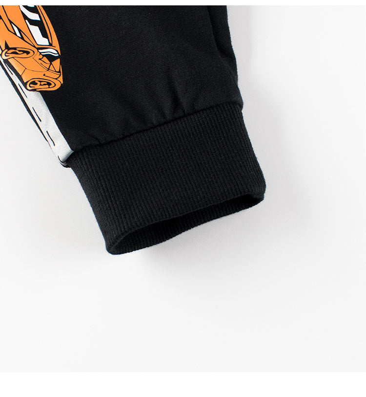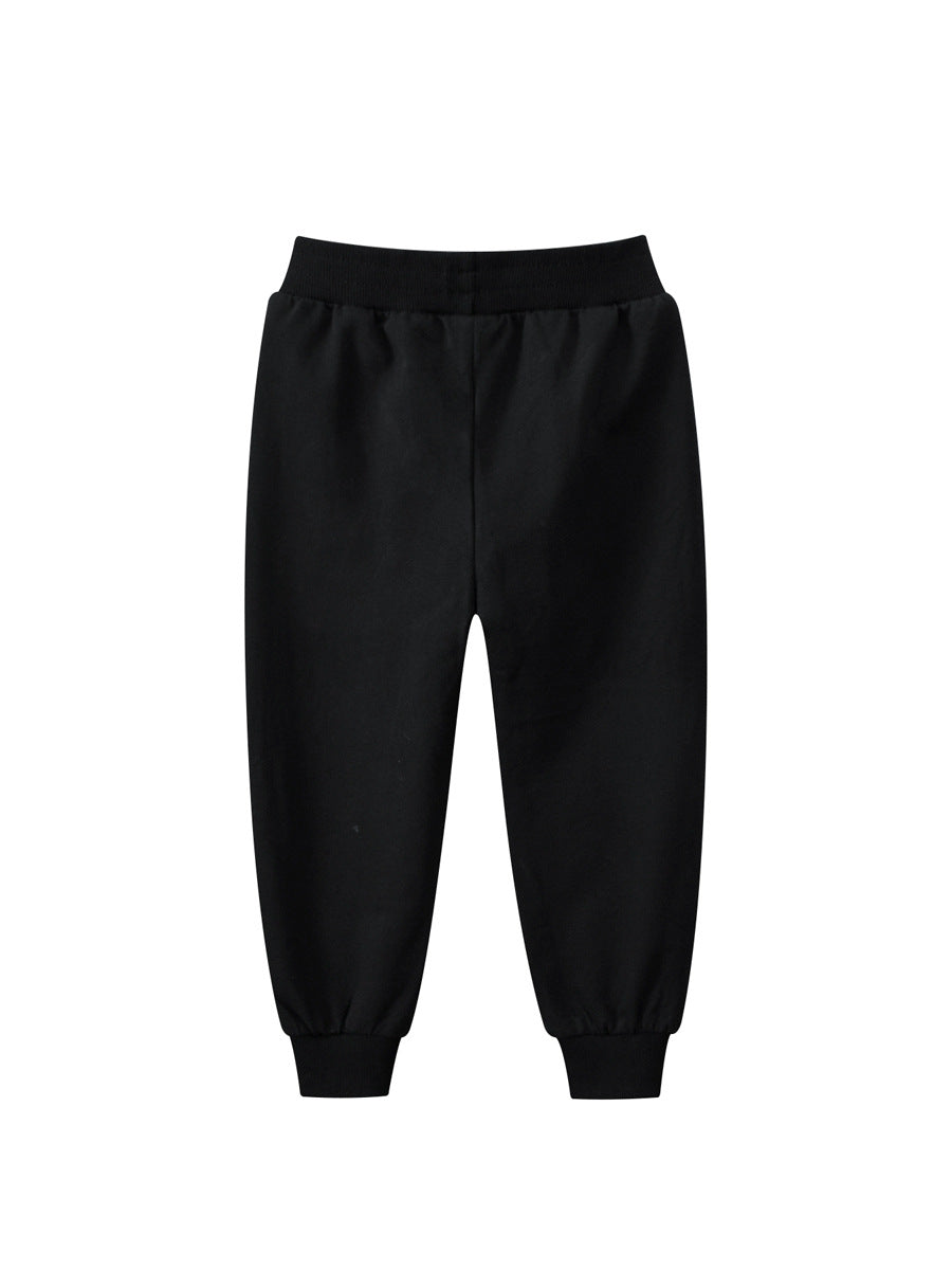 Baby boys' black car racing cartoon sports trousers with pockets, made of cotton, perfect for active play.