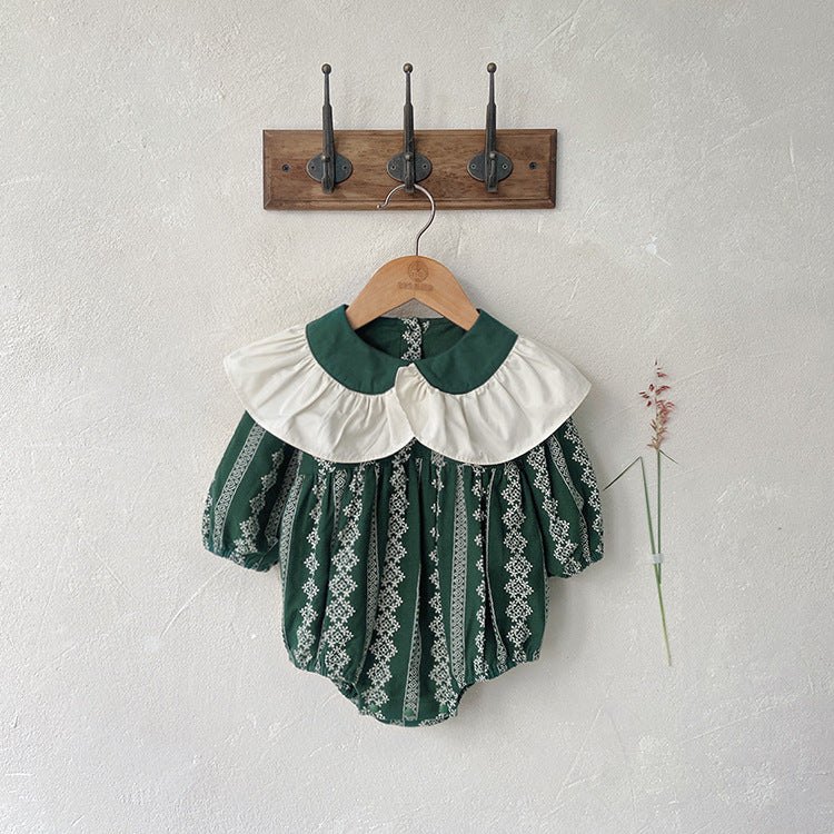 These onesies are crafted from high-quality cotton, ensuring that your baby girl stays comfortable throughout the day. The soft fabric is gentle on delicate skin, making it an ideal choice for everyday wear or special occasions. The floral pattern adds a touch of charm, while the big lapel design enhances the overall elegance of the outfit.