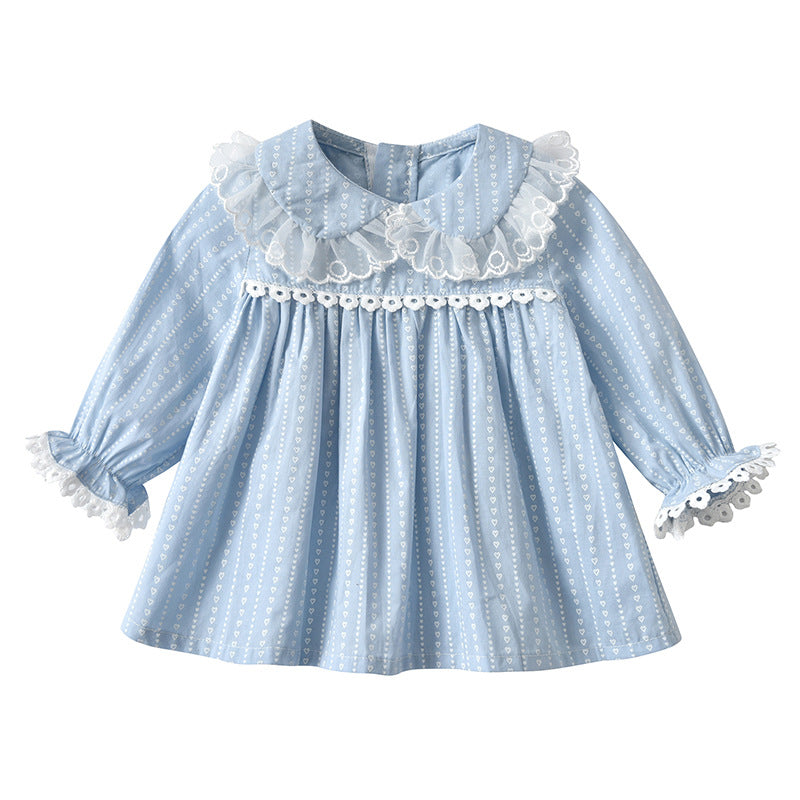 This charming outfit comes in a lovely blue color, making it a versatile addition to your baby girl's wardrobe. The heart pattern adds a playful touch, while the ruffle doll neck gives it a unique and fashionable flair. The embroidered details enhance the overall look, making it suitable for both casual outings and special events.