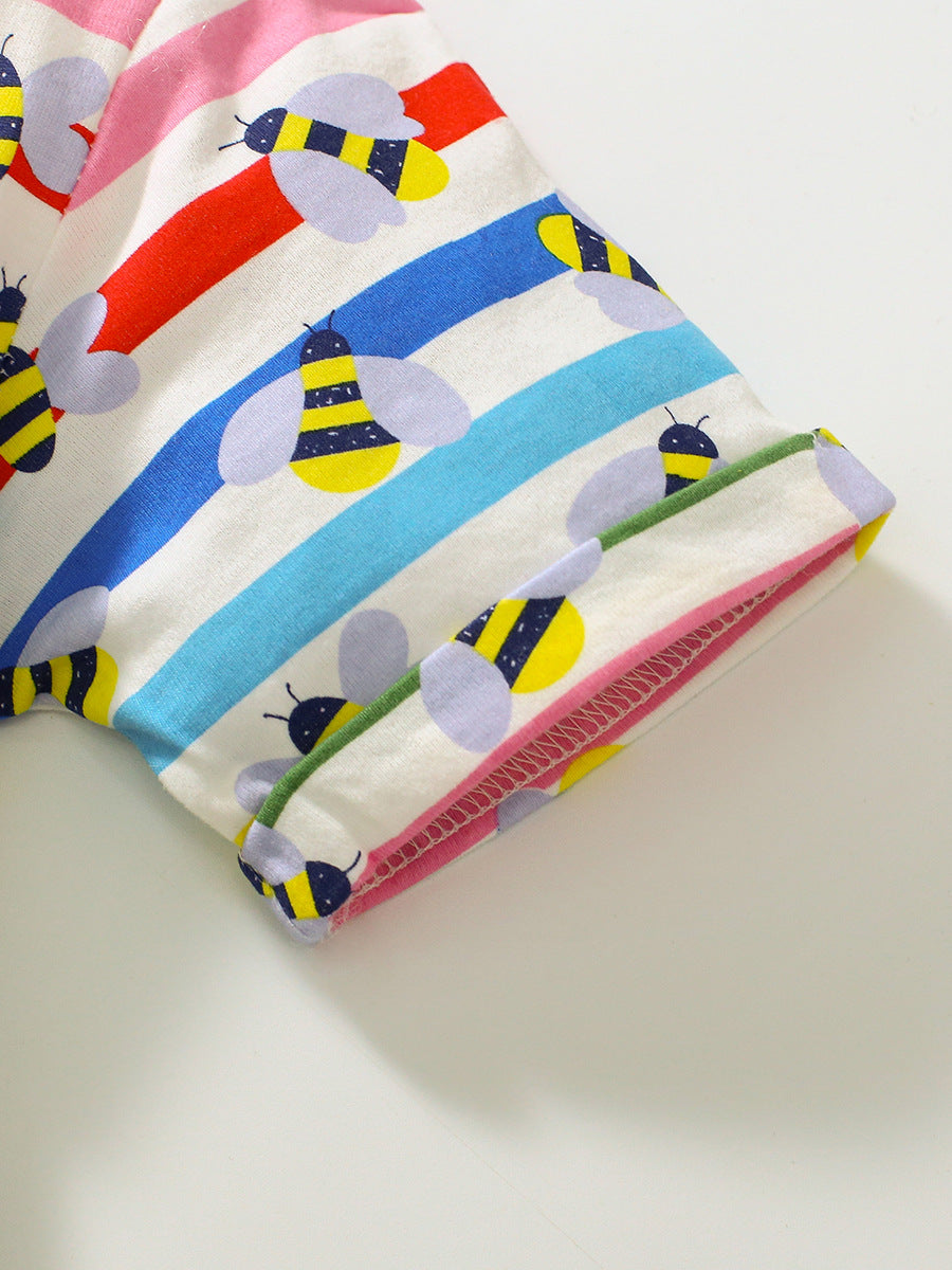 Introducing our delightful Baby Girls Rainbow Striped Short Sleeves Bees Pattern Dress, a perfect blend of style and comfort for your little princess. This charming dress features a vibrant rainbow striped design that is sure to brighten up any summer day. Made from high-quality cotton, it ensures that your baby girl stays comfortable while looking adorable.