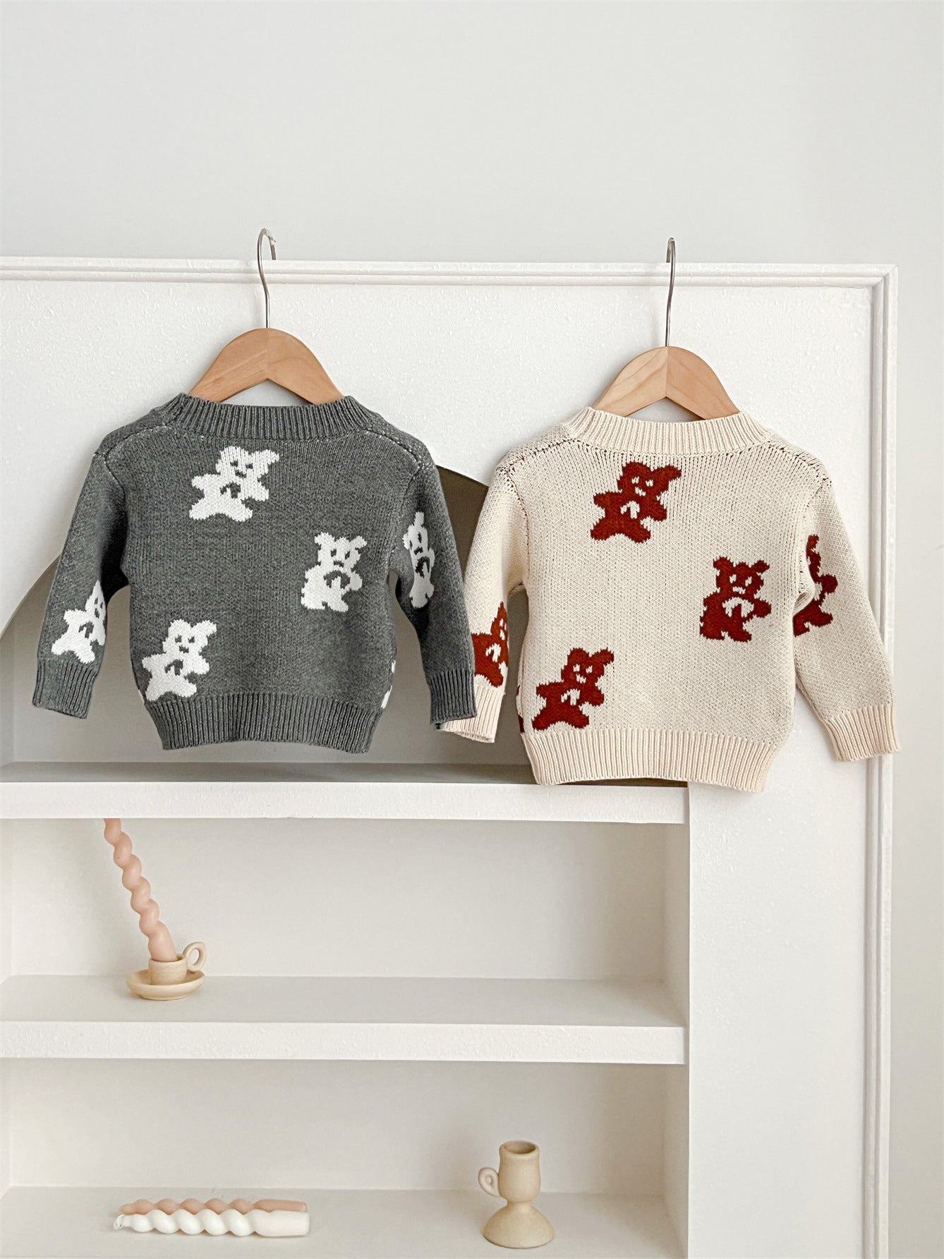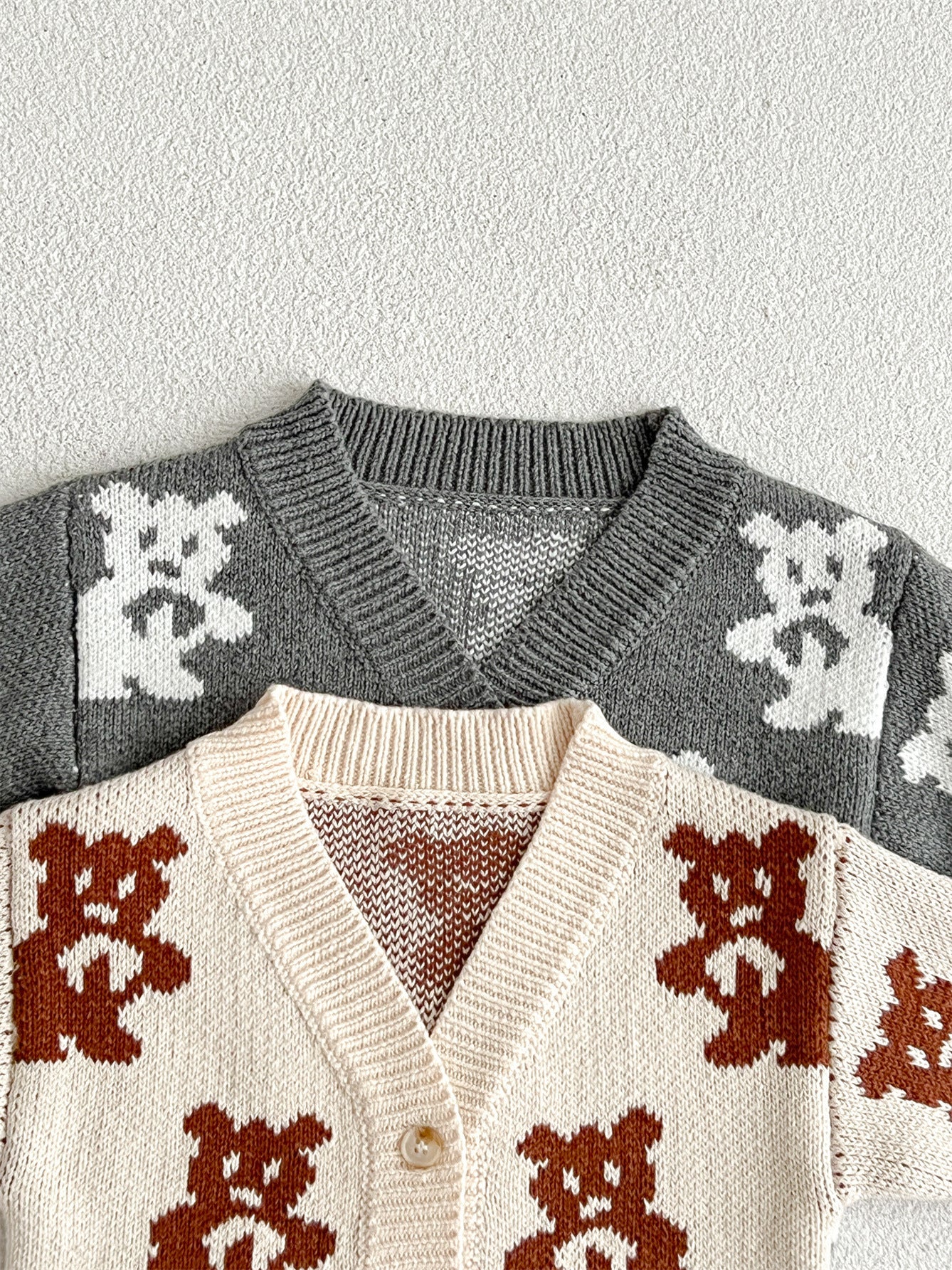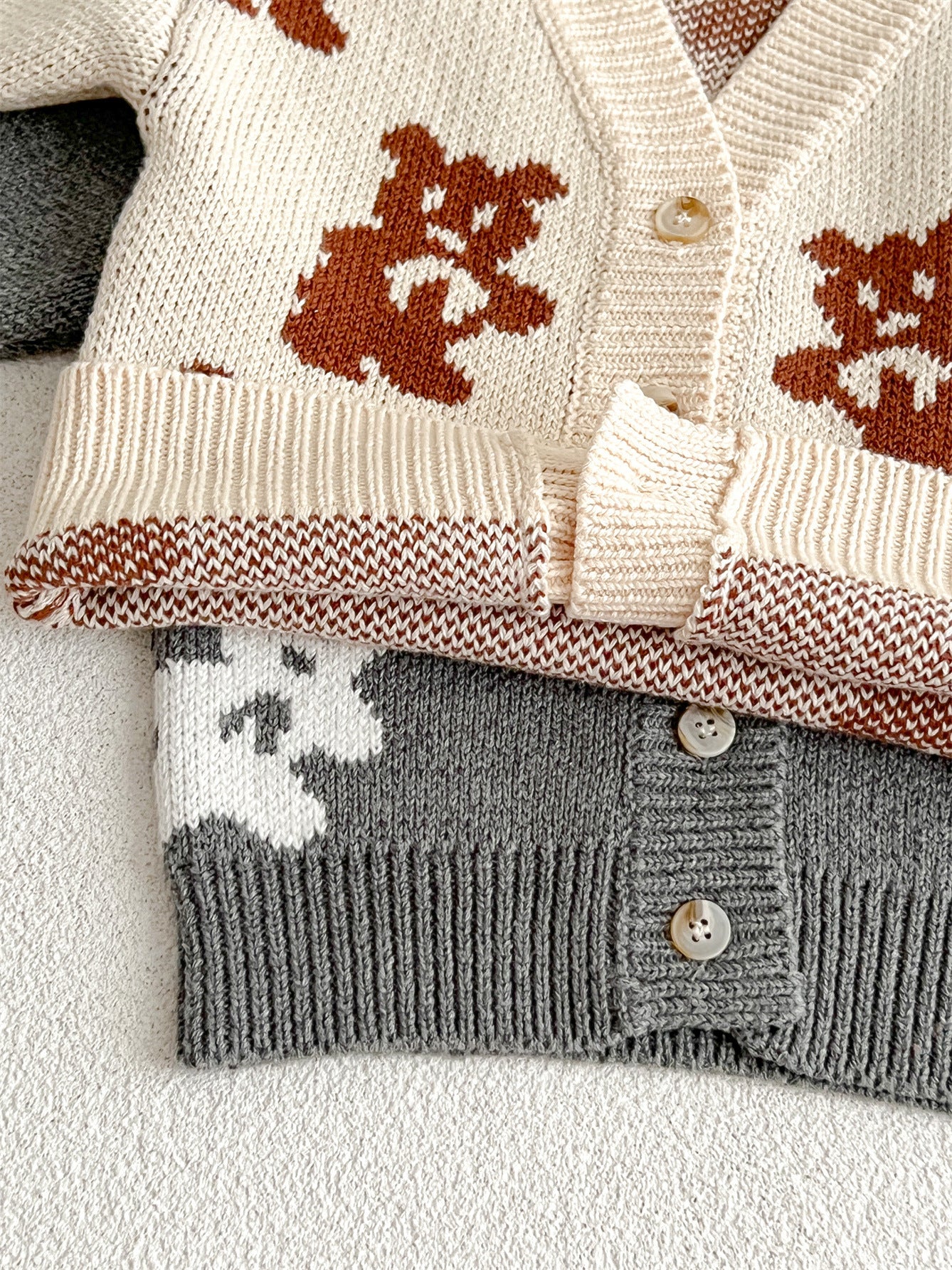 Baby unisex long-sleeved cardigan featuring a cute bear pattern in grey and beige colors, perfect for infants and toddlers.
