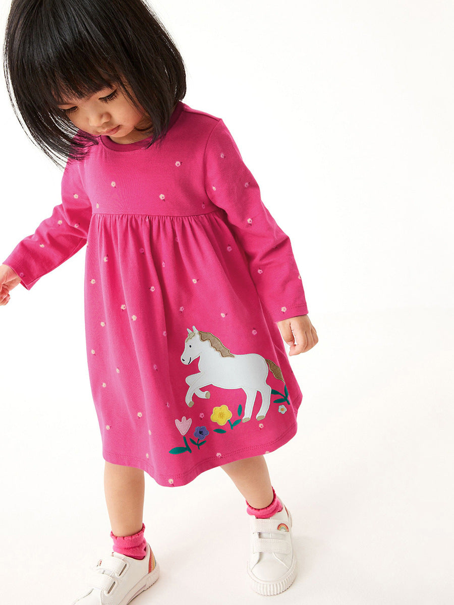 Introducing our Cheap Autumn Girls Cartoon Flowers and Horse Pattern Crew Neck Long Sleeve Shirt, a delightful addition to your little girl's wardrobe. This shirt combines comfort, style, and playful designs, making it perfect for the autumn season. Crafted from high-quality cotton, it ensures that your child stays cozy while looking adorable.