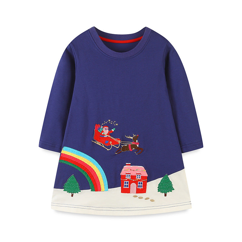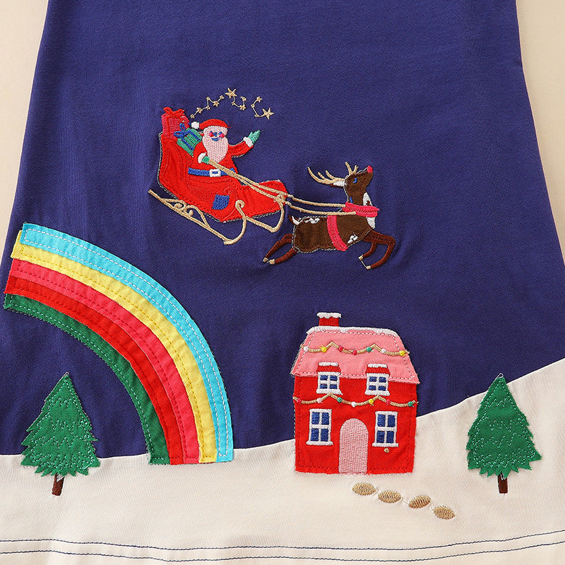 In summary, the Girls’ Navy Blue Christmas Cartoon Pattern Embroidery Dress is a must-have for any young girl's wardrobe. With its charming design, comfortable material, and versatile sizing, it is perfect for festive occasions and everyday wear alike. Treat your little girl to this delightful dress and watch her light up with joy!